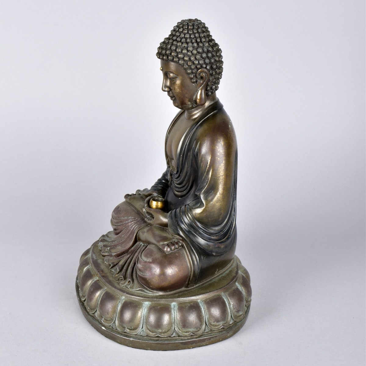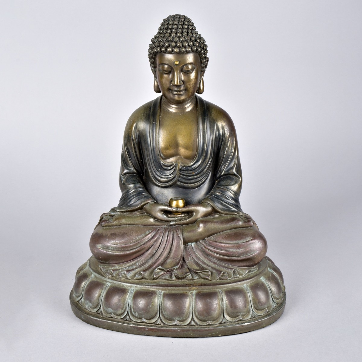 Vintage Chinese Bronze Style Composition Seated Buddha. Measures 10-1/8" x 7-7/8" x 6-1/4". Provenance: The Orianne Collins Collection. A large portion of proceeds of this sale will be donated to Ms Collinsí charity of choice, the "Never Give Up Foundation" which fills in the gaps needed to build a more inclusive future for those with disabilities like Spinal Muscular Atrophy. Condition: Surface rubbing otherwise good condition. Estimate: $50.00 - $150.00 Domestic Shipping: $78.00