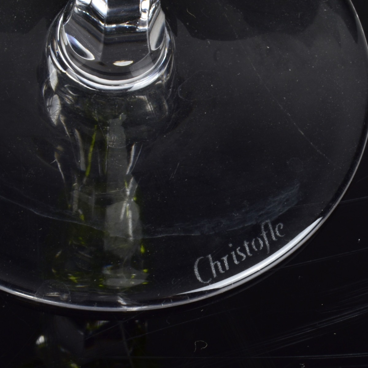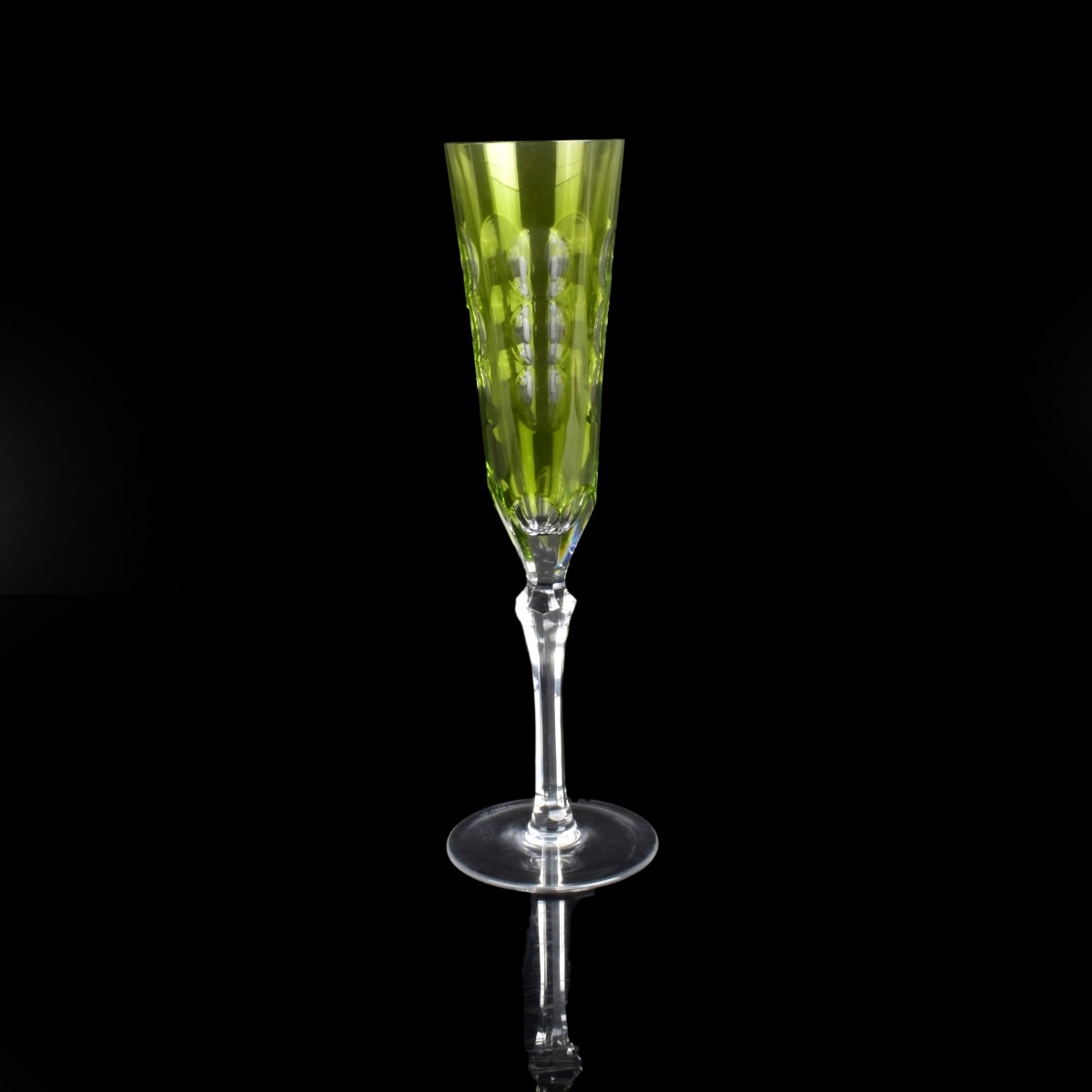 Lot of Seven Christofle "Kawali" Crystal Fluted Champagne Glasses. Signed. Measures 9" x 2-1/4" diam. Provenance: The Orianne Collins Collection. A large portion of proceeds of this sale will be donated to Ms Collinsí charity of choice, the "Never Give Up Foundation" which fills in the gaps needed to build a more inclusive future for those with disabilities like Spinal Muscular Atrophy. Condition: Good condition. Estimate: $100.00 - $300.00 Domestic Shipping: $78.00