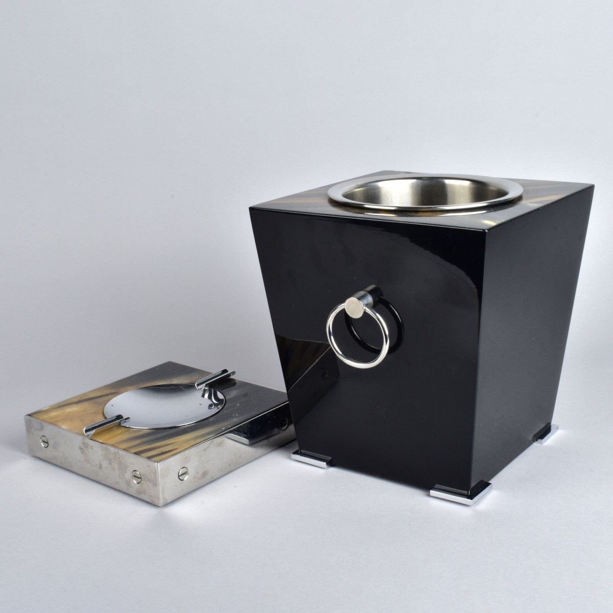 Grouping of Two Arca Italian Tableware to Include a Lacquered Ice Bucket together with a Chrome and Lacquered Arca Ashtray. Signed. Tong to accompany the lot. Ice bucket measures 8-1/2" x 7-3/4" x 7-3/4". Ashtray measures 1-1/2" x 6-1/2". Provenance: The Orianne Collins Collection. A large portion of proceeds of this sale will be donated to Ms Collinsí charity of choice, the "Never Give Up Foundation" which fills in the gaps needed to build a more inclusive future for those with disabilities like Spinal Muscular Atrophy. Condition: Both are in good condition. Estimate: $100.00 - $500.00 Domestic Shipping: $88.00
