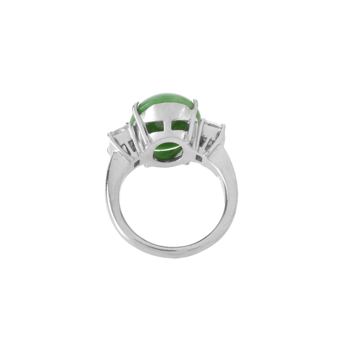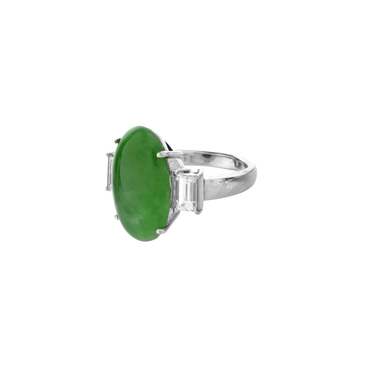 Fine Approx. 10.51 Carat TW Oval Cabochon Natural Jade, 1.06 Carat TW Two Baguette Cut Diamond and Platinum Ring. Jade with vivid apple green color. Diamonds F-G color, VVS-VS clarity. Stamped Pt900. Ring size 7. Approx. weight: 14.5 grams. Condition: Very good condition. For additional information and/or WhatsApp video please contact our resident GIA Graduate Gemologist, Russ Kodner at 954.650.5030 Estimate: $800.00 - $10,000.00 Domestic Shipping: $40.00