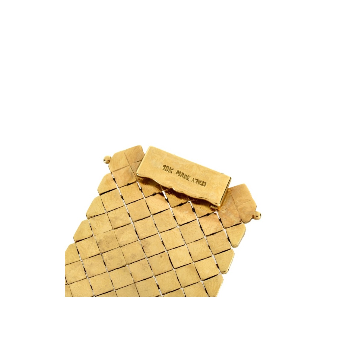 Lady's Vintage Italian Universal Geneve for Tiffany & Co 18 Karat Yellow Gold Wide Mesh Link Bracelet Watch. Manual wind movement. Signed, clasp stamped Italy 18K. Measures 7-1/4" L, 1-1/4" W. Approx. gross weight: 107.24 grams. Condition: Very good pre-owned condition. Running. Please note the gallery does not warranty the running condition of watches. For additional information and/or WhatsApp video please contact our resident GIA Graduate Gemologist, Russ Kodner at 954.650.5030 Estimate: $7000.00 - $9000.00 Domestic Shipping: $40.00