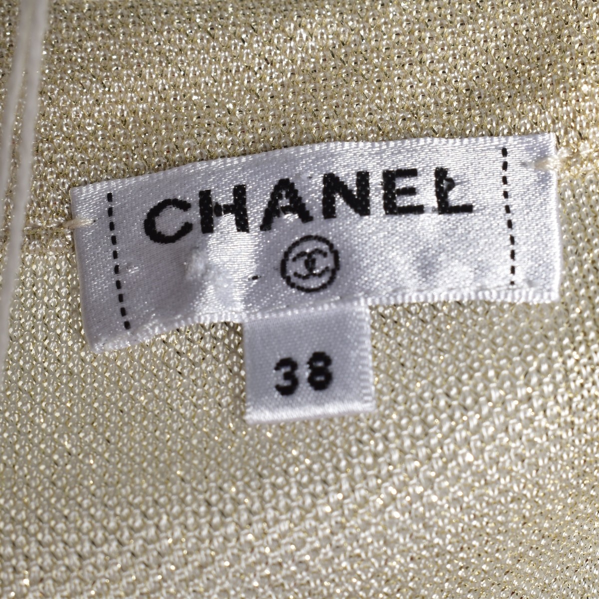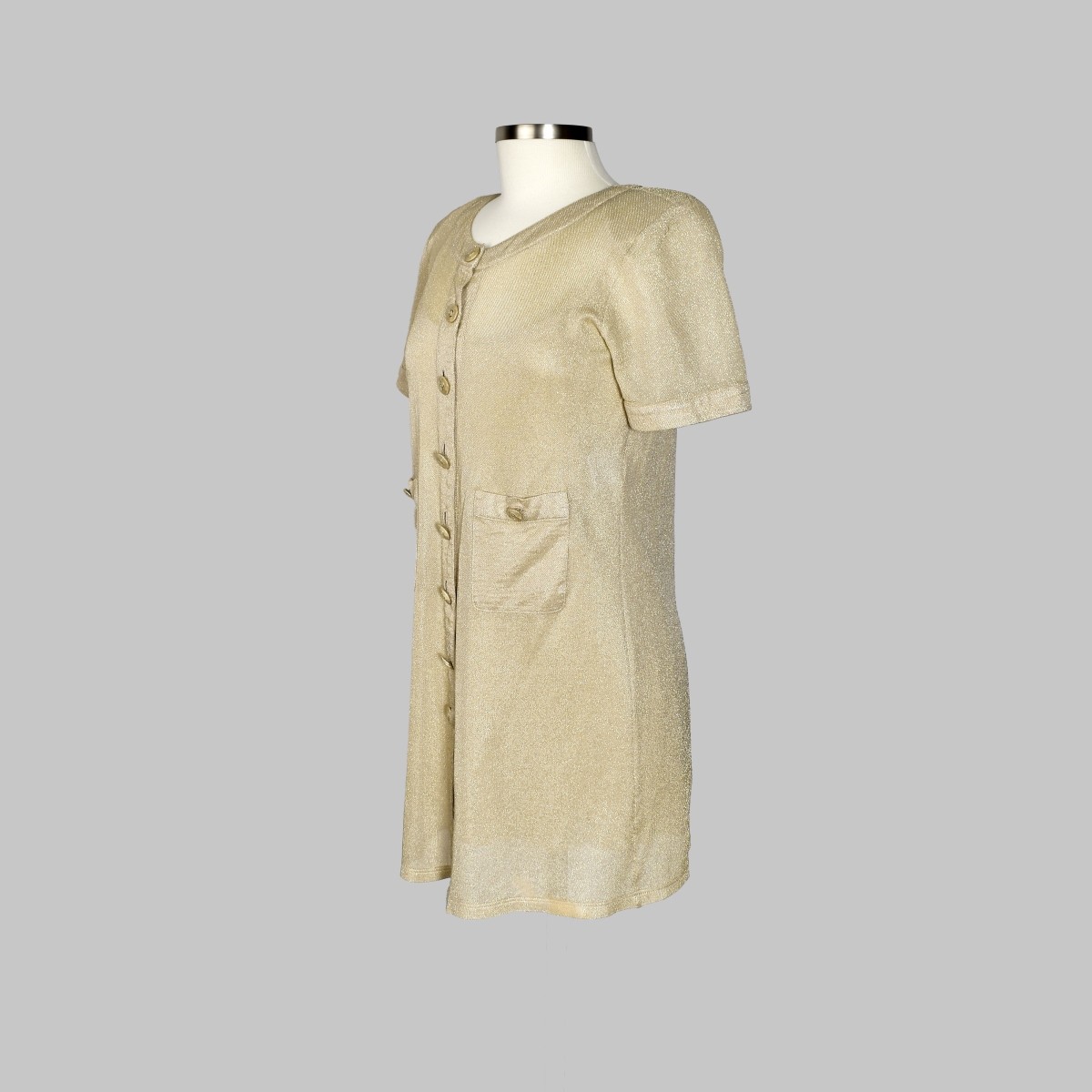 Chanel Gold Metallic Two Piece Mini Dress, with spaghetti strap slip. Classic Chanel Buttons accent the front. Serial # 58323V41057. Size 38 made in Italy. Measures shoulder to shoulder 16" x 32"L. Slip 22-1/2"L. Provenance: The Orianne Collins Collection. A large portion of proceeds of this sale will be donated to Ms Collinsí charity of choice, the "Never Give Up Foundation" which fills in the gaps needed to build a more inclusive future for those with disabilities like Spinal Muscular Atrophy. Condition: Good Condition. Estimate: $500.00 - $1000.00 Domestic Shipping: $42.00