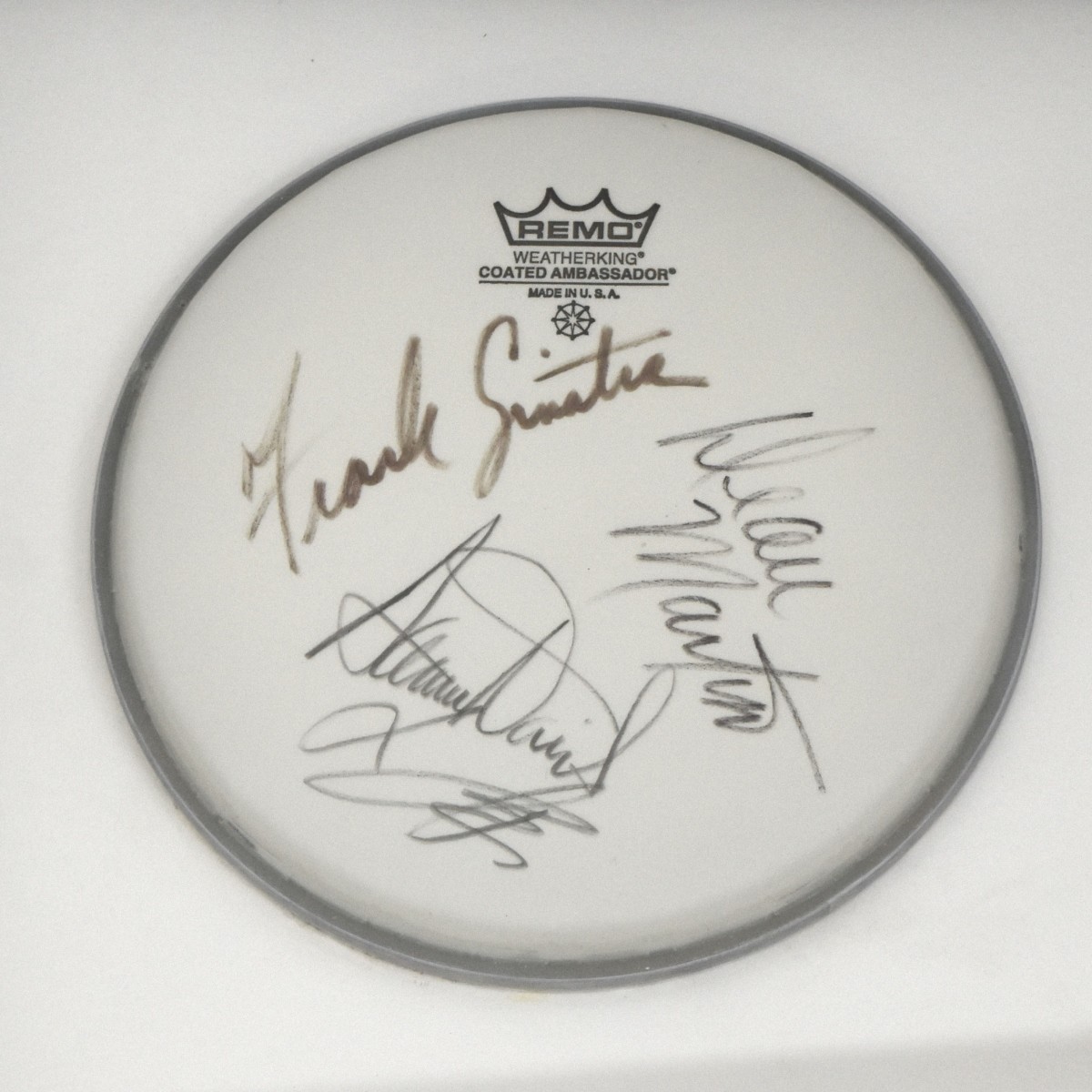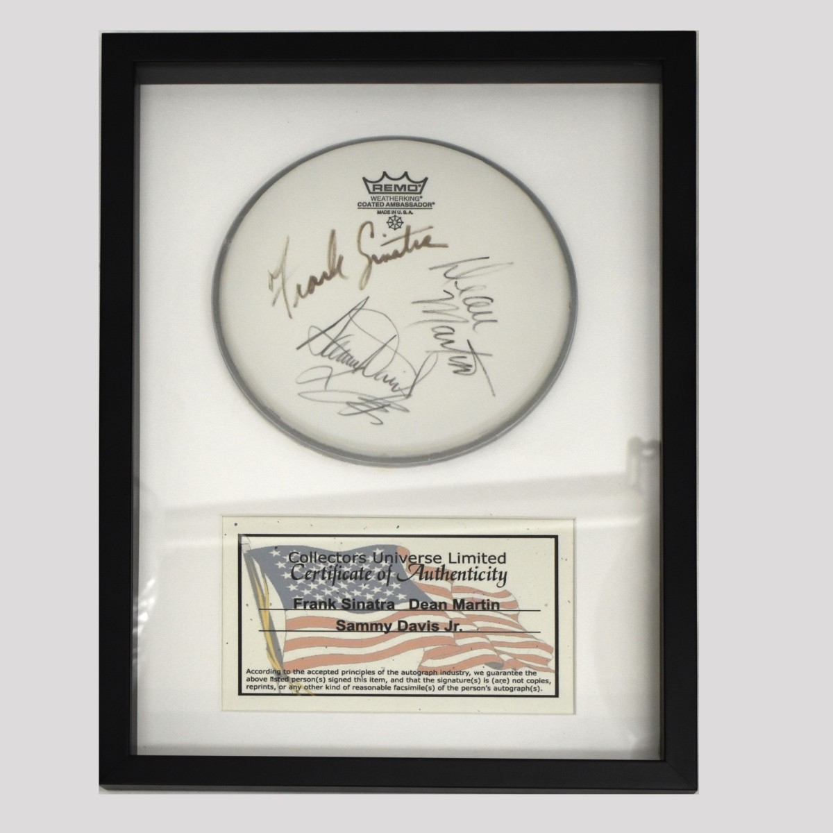 Framed Autographed Drum Head by Sammy Davis Jr., Frank Sinatra, and Dean Martin. Collector's Universe Limited COA to accompany the lot. Frame measures 19-1/4" x 13-5/8".Provenance: The Orianne Collins Collection. A large portion of proceeds of this sale will be donated to Ms Collinsí charity of choice, the "Never Give Up Foundation" which fills in the gaps needed to build a more inclusive future for those with disabilities like Spinal Muscular Atrophy. Condition: Good condition. Estimate: $200.00 - $1000.00 Domestic Shipping: $115.00