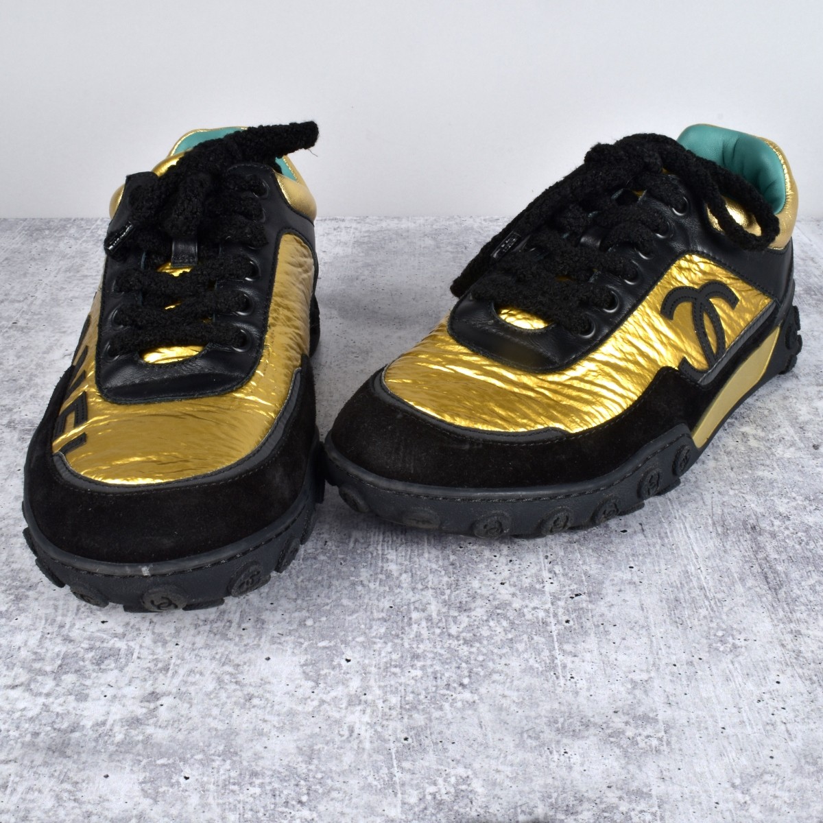 Chanel Sports Shoes Black and Gold. Serial # G34086 Size 37-1/2 (7). Provenance: The Orianne Collins Collection. A large portion of proceeds of this sale will be donated to Ms Collinsí charity of choice, the "Never Give Up Foundation" which fills in the gaps needed to build a more inclusive future for those with disabilities like Spinal Muscular Atrophy. Condition: Good Condition Estimate: $200.00 - $500.00 Domestic Shipping: $52.00