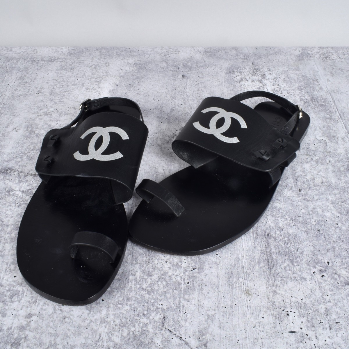 Chanel Black Leather single toe Sandal. Serial Number G36885 Size Woman 39. Provenance: The Orianne Collins Collection. A large portion of proceeds of this sale will be donated to Ms Collinsí charity of choice, the "Never Give Up Foundation" which fills in the gaps needed to build a more inclusive future for those with disabilities like Spinal Muscular Atrophy. Condition: Good Condition, Has typical wear for a pre owned item. Estimate: $100.00 - $500.00 Domestic Shipping: $52.00