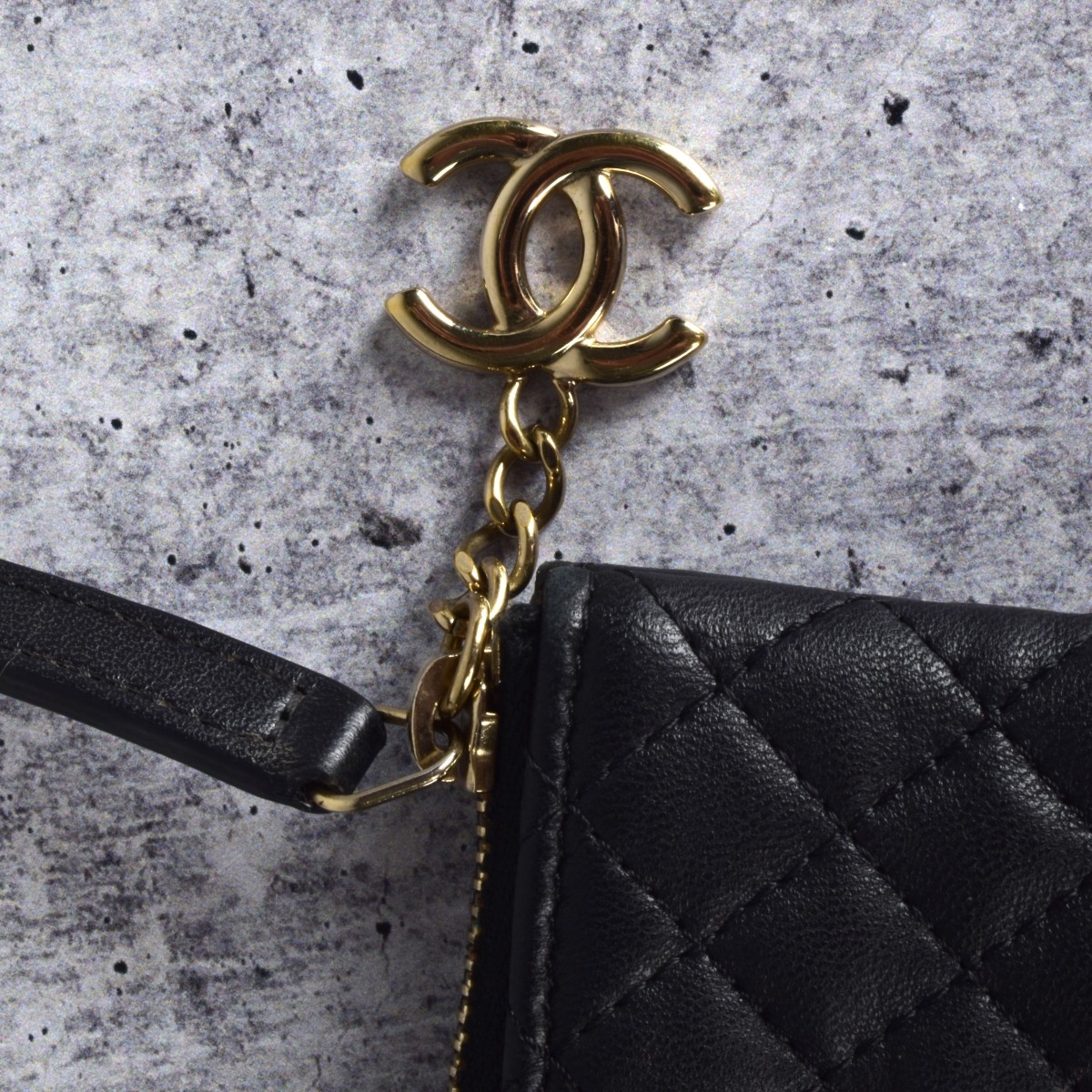 Chanel Black Quilted Lambskin Clutch. Gold tone double c zipper closure. Measures 7-3/4" x 10-3/4". Provenance: The Orianne Collins Collection. A large portion of proceeds of this sale will be donated to Ms Collinsí charity of choice, the "Never Give Up Foundation" which fills in the gaps needed to build a more inclusive future for those with disabilities like Spinal Muscular Atrophy. Condition: Good condition. Estimate: $1000.00 - $1500.00 Domestic Shipping: $45.00