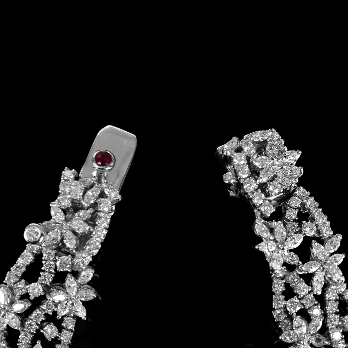Stunning Contemporary Approx. 110.0 Carat TW Fifteen Hundred Twenty-two Marquise and Round Brilliant Cut Diamond and 18 Karat White Gold Necklace with Small Round Cut Ruby at Clasp. Diamonds G-H color, VVS-VS clarity. Stamped 18K. Measures 16" L. 1-3/4" W. Approx. weight: 214.4 grams. Condition: Very good condition. For additional information and/or WhatsApp video please contact our resident GIA Graduate Gemologist, Russ Kodner at 954.650.5030 Estimate: $90,000.00 - $110,000.00 Domestic Shipping: 48.00