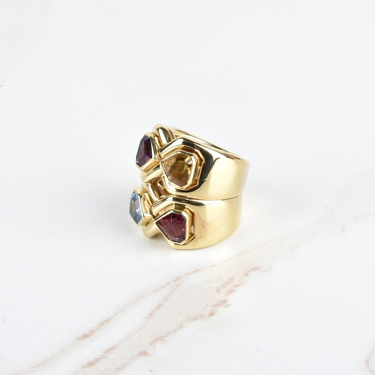 Retro Multi Gemstone and Wide Heavy 18 Karat Yellow Gold Cocktail Ring. Set with shield shape amethyst, citrine, tourmaline and London blue topaz weighing approx 1.0 carat each. Ring size 5. Approx. weight: 33.25 grams. Condition: Very good condition. For additional information and/or WhatsApp video please contact our resident GIA Graduate Gemologist, Russ Kodner at 954.650.5030 Estimate: $2000.00 - $2500.00 Domestic Shipping: $40.00