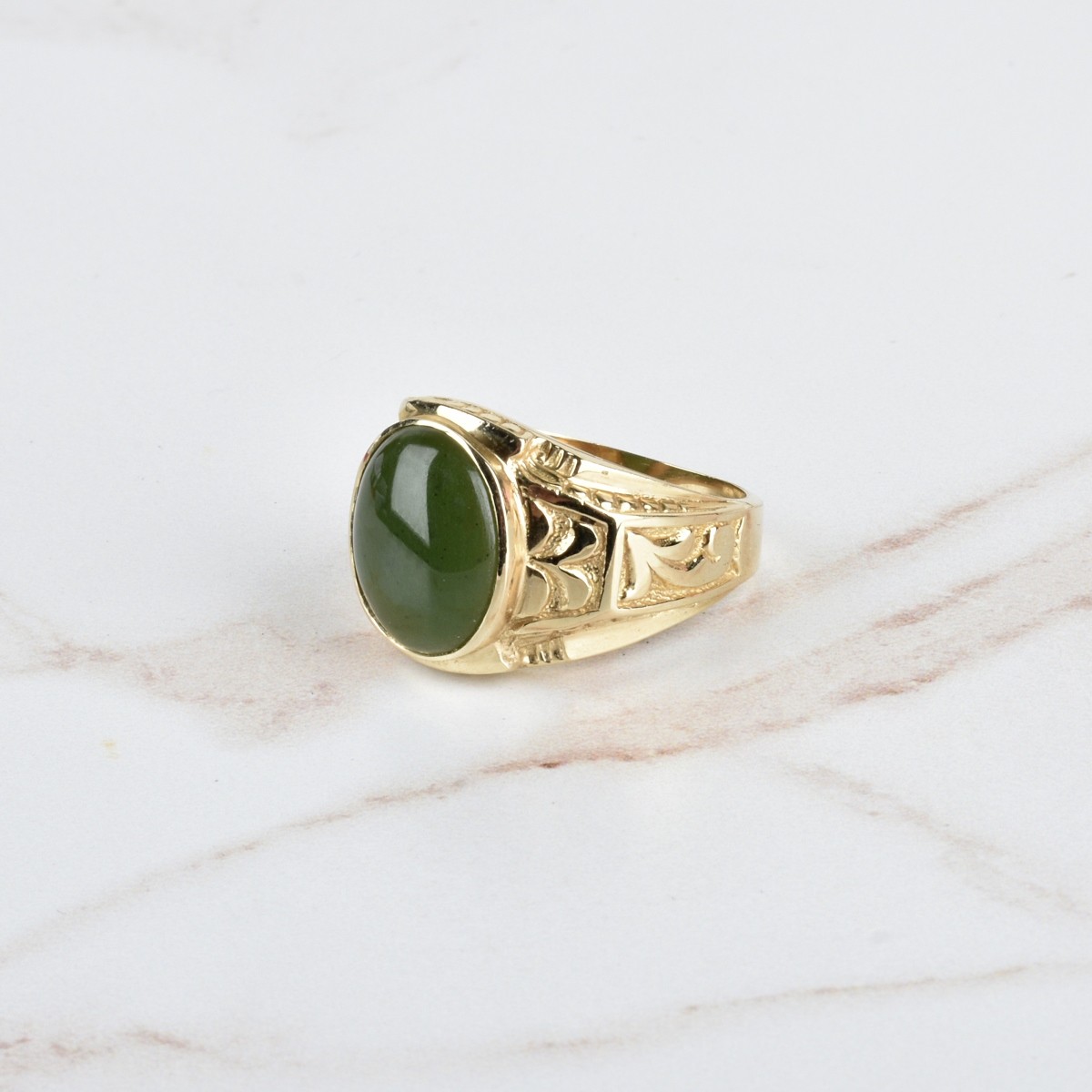 Man's Vintage Nephrite Jade and 14 Karat Yellow Gold Ring. Stamped 14K. Ring size 9. Approx. weight: 11.11 grams. Condition: Very good condition. For additional information and/or WhatsApp video please contact our resident GIA Graduate Gemologist, Russ Kodner at 954.650.5030 Estimate: $1000.00 - $1500.00 Domestic Shipping: $40.00