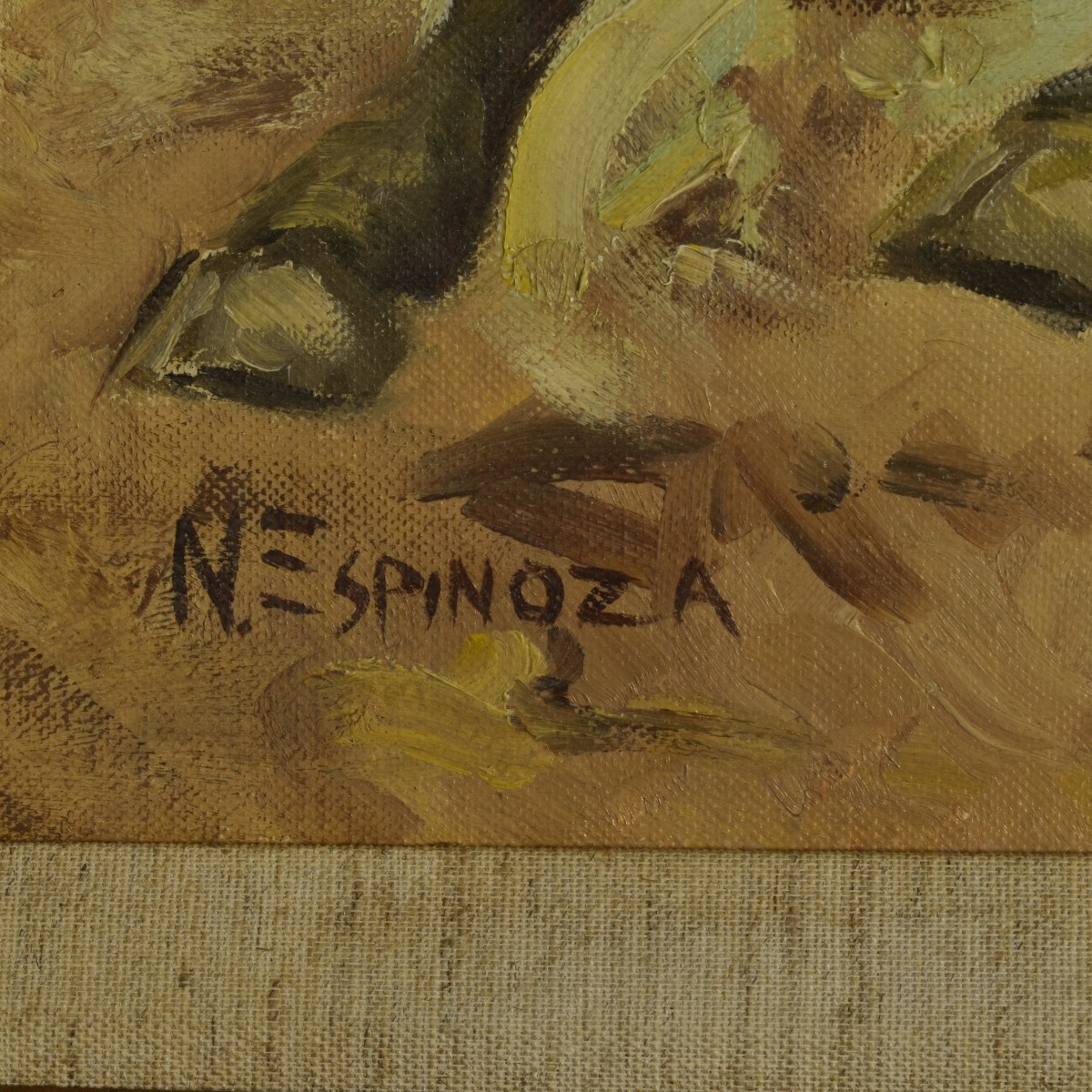 Noel Espinoza, Mexican (20/21st century) Oil on Board "Bullfighting" Signed Lower Left. Measures 13-3/8" x 17-1/2". Frame measures 19-3/4" x 23-3/4". Condition: Good condition. Estimate: $100.00 - $300.00 Domestic Shipping: $115.00