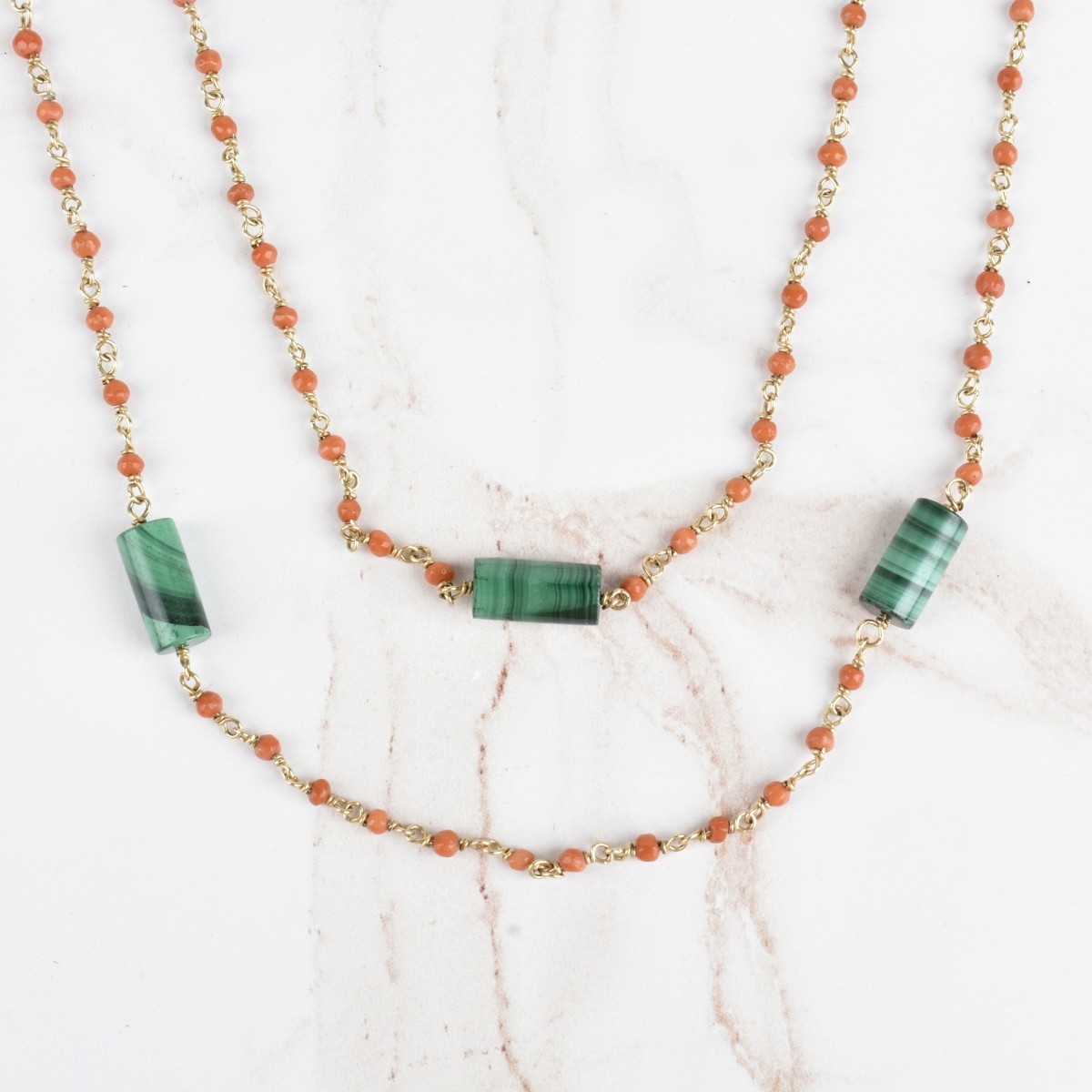 Vintage Italian Red Coral Bead, Malachite Bead and 14 Karat Yellow Gold Long Necklace. Clasp stamped 585. Measures 52" L. Approx. weight: 35.46 grams. Condition: Very good vintage condition. For additional information and/or WhatsApp video please contact our resident GIA Graduate Gemologist, Russ Kodner at 954.650.5030 Estimate: $1000.00 - $2000.00 Domestic Shipping: $40.00