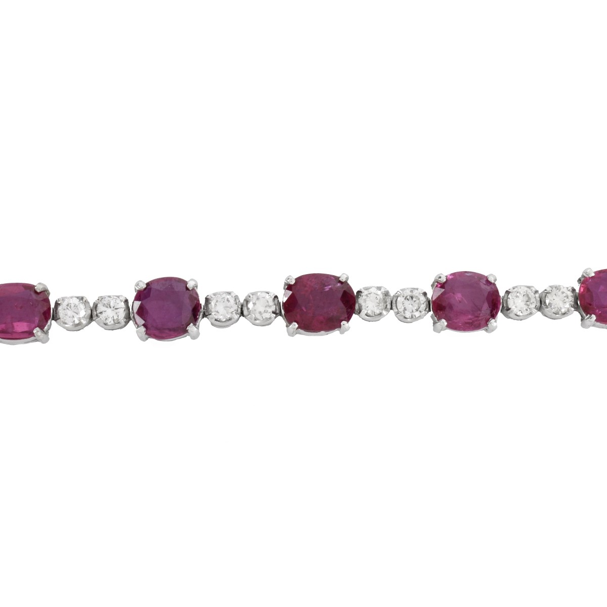 Approx. 14.0 Carat TW Eleven Oval Cut Natural Rubies, 1.75 Carat TW Twenty-two Round Brilliant Cut Diamond, and 18 Karat White Gold Bracelet. Rubies with good color and clarity. Diamonds F-G color, VS1-SI1 clarity. Measures 6-1/4" L. Approx. weight: 13.5 grams. Condition: Very good condition. For additional information and/or WhatsApp video please contact our resident GIA Graduate Gemologist, Russ Kodner at 954.650.5030 Estimate: $8000.00 - $10,000.00 Domestic Shipping: $40.00