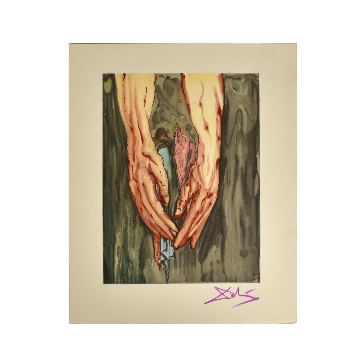 Salvador Dali, Spanish (1904 - 1989) Color Woodcut Engraving on BFK Rives Paper "The Climb of Geryon" (the Divine Comedy series) Signed Lower Right. Sheet measures 13" x 10-3/8". Please note, this lot will be rolled in a shipping tube. Condition: Good condition. Estimate: $100.00 - $200.00 Domestic Shipping: $45.00