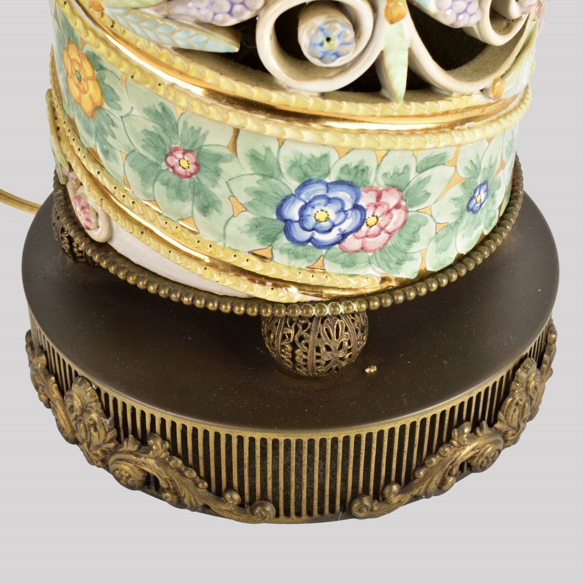 Antique Capodimonte Porcelain Lamp Mounted on Brass Hardware. Signed. Overall measures 36-1/4" x 7-1/4". Condition: Some small hairline cracks and a small chip to the surface. Estimate: $100.00 - $300.00 Domestic Shipping: Third party