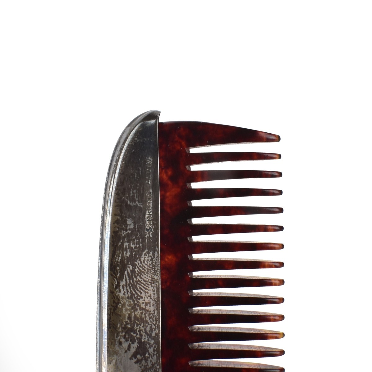 Alvin Sterling Silver Dresser Set. Hairbrush and comb cover in a fitted box. Marked Sterling Alvin. Brush measures 6-1/4" L, Box measures 2" H x 8-1/2" L x 4-5/8" W. Condition: Good condition, needs a polish. Estimate: $50.00 - $150.00 Domestic Shipping: $52.00