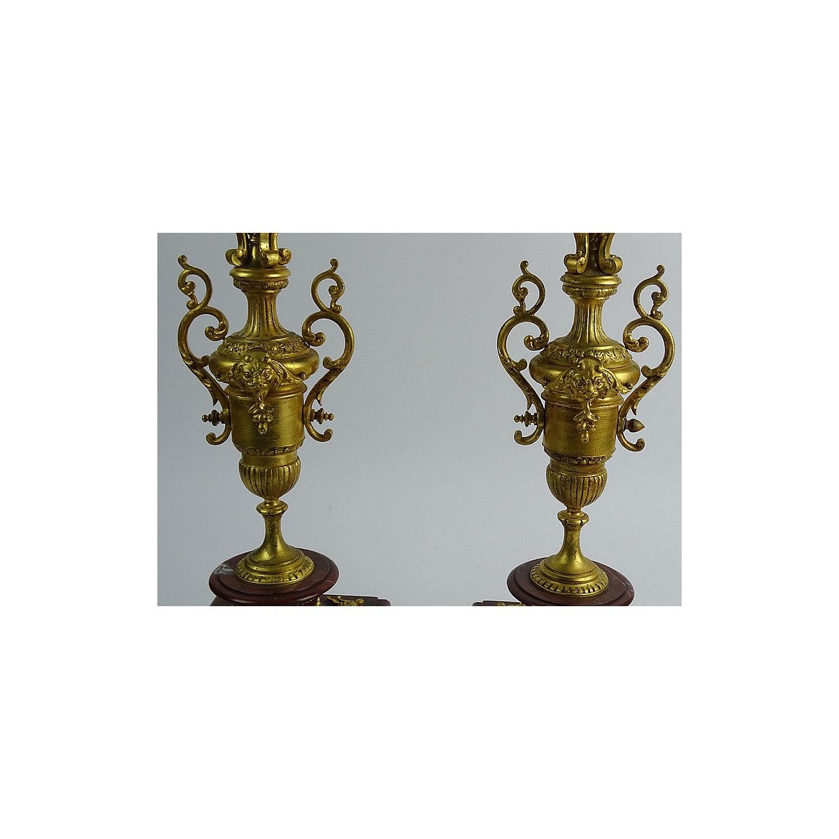 Pair of Late 19th Century French Gilt Bronze and Rouge Marble Five Light Candelabra. Unsigned.. Measure 24-7/8 Inches Tall and 8-1/4 Inches Wide. Condition: Small Nicks to Marble, Missing Two (2) Small Bronze Mounts Otherwise Good Condition Estimate: $450.00 - $900.00 Domestic Shipping: Third party