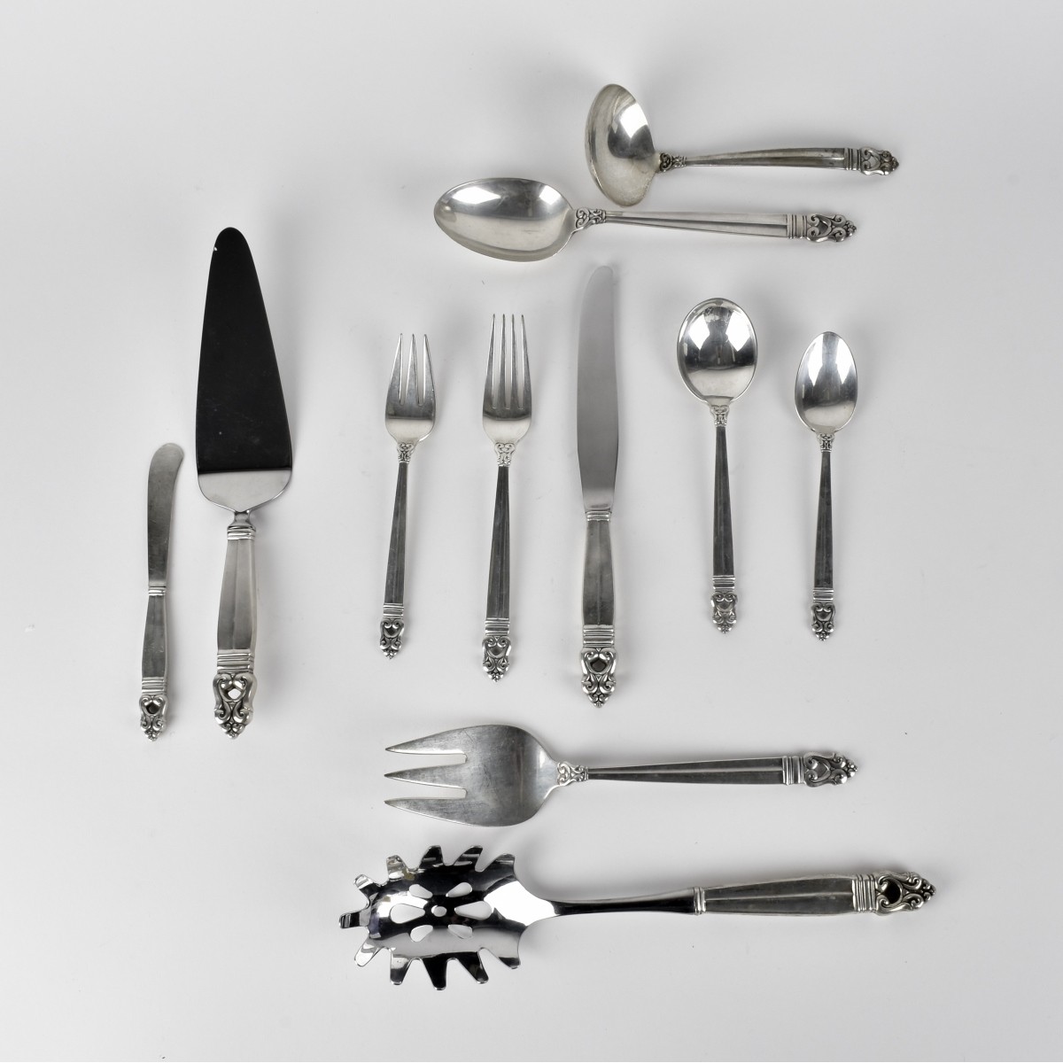 Seventy Eight (78) International Royal Danish Sterling Silver Flatware Set. 12 Hollow Handled Knives 5-7/8", 12 Butter Knives, 12 Forks 7-1/8", 12 Salad Forks, 12 Teaspoons, 12 Cream Soup. 1 Meat Fork 8-7/8", 1 Gravy Ladle 6-1/2", 2 Serving Spoons 8-1/2", 1 Hollow Handle Pie Server 10", 1 Hollow Handled Spaghetti Server. Weight 97.50 troy ounces Total Weight 131.45 troy ounces Condition: Good condition, needs a polish, Box is not included. Estimate: $2000.00 - $3000.00 Domestic Shipping: $98.00