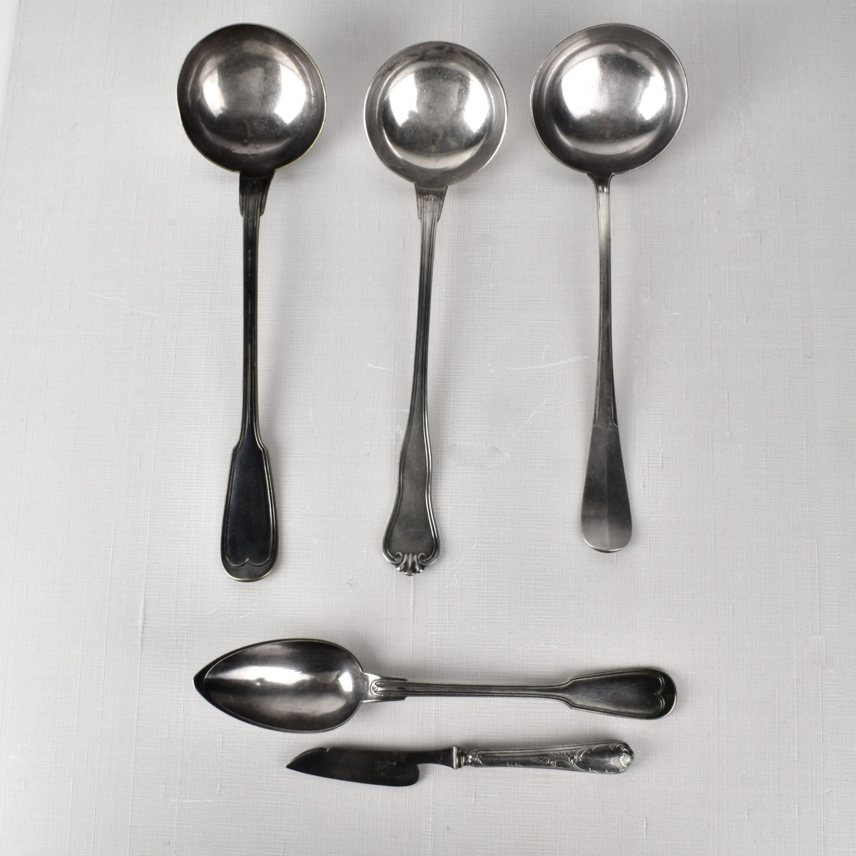 Grouping of five Christofle Silverplate Tableware. Includes: three soup ladles together with a serving spoon and a fish Knife. Stamped with hallmarks. Largest soup ladle measures 13-1/4" x 3-3/4". Serving spoon measures 11-1/8". Condition: Tableware needs cleaning. a few have dings to the bowls. Estimate: $200.00 - $400.00 Domestic Shipping: $72.00