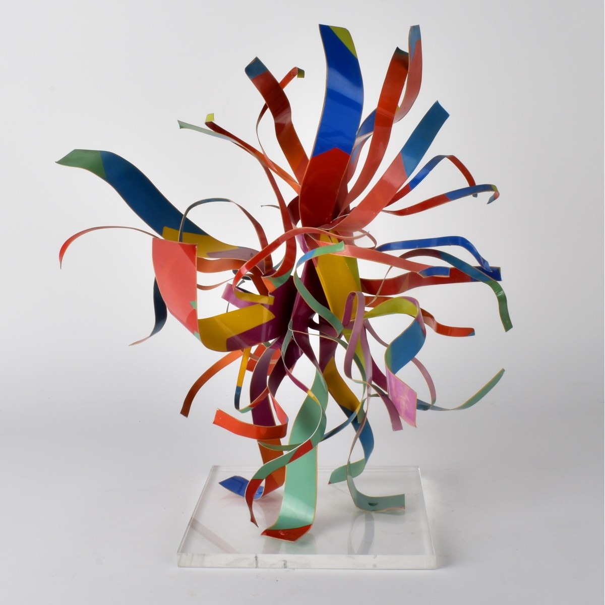 Dorothy Gillespie, American (1920 - 2012) Enamel on Aluminum Sculpture "Ribbon" Signed. Mounted on Lucite base. Overall measures 15-3/4" x 14" x 13-1/2". Condition: Good condition. Estimate: $200.00 - $500.00 Domestic Shipping: Third party