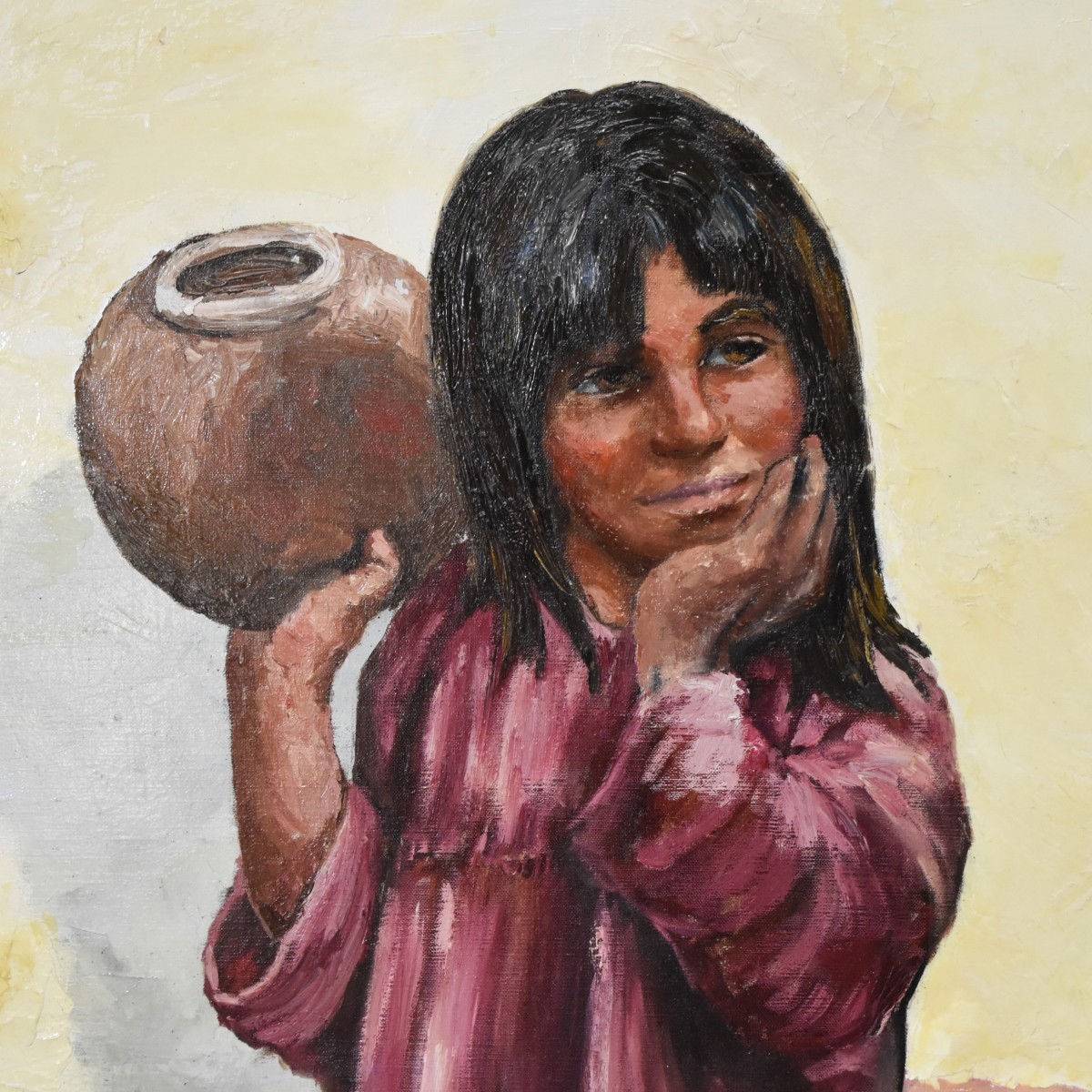 Signed Primitivo oil on Canvas, Girl with Water Pot. Signed lower left Primitivo. Measures 40-1/4" H x 30" W. Frame 47-3/8" H x 37-1/4"W. Condition: Good Condition. Estimate: $150.00 - $250.00 Domestic Shipping: Third Party