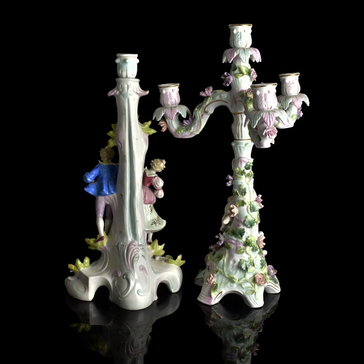 Grouping of Two Dresden Style Porcelain Figural Tableware. Includes: candelabra and candleholder. Both are unsigned. Candelabra measures 17-1/8" x 10-1/2" x 10". Candleholder measures 15-1/2" x 8" x 5-3/4". Condition: Some chips and losses to the surface of both items. Estimate: $100.00 - $300.00 Domestic Shipping: Third party