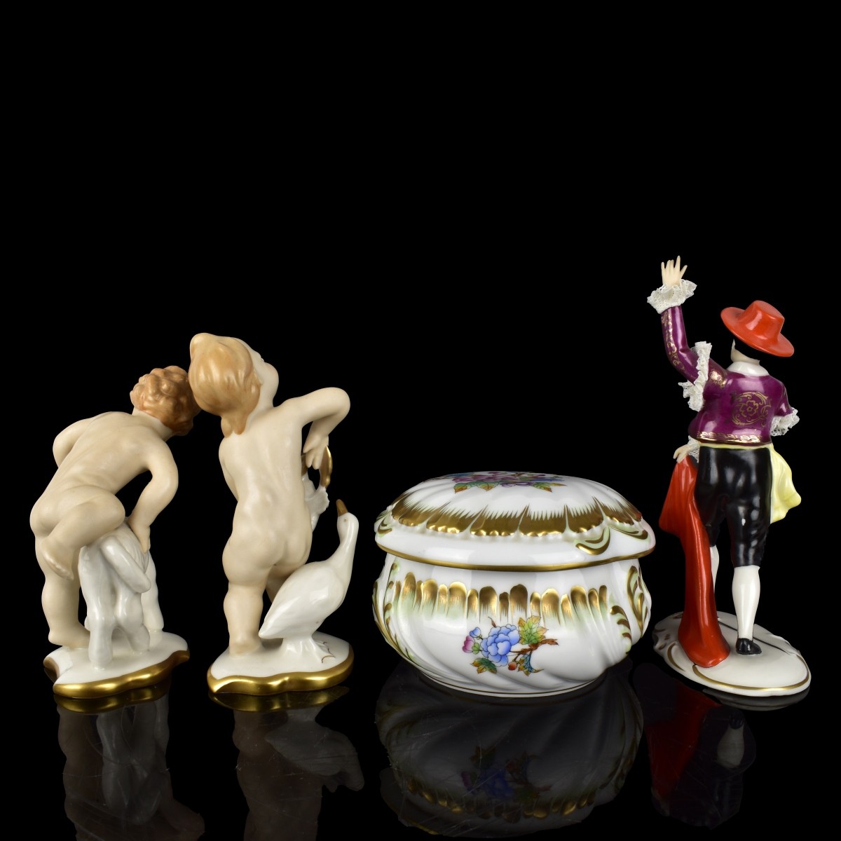 Grouping of Four Vintage Porcelain Tableware. Includes: three Alka Kunst figurines and Herend covered box. Marked and numbered on the base. Tallest figurine measures 6-3/4" x 2-3/4" x 3-3/4". Box measures 3-1/4" x 4-3/4". Condition: Tallest figurine has some rubbing and possible nicks to the lace. Estimate: $100.00 - $150.00 Domestic Shipping: $75.00