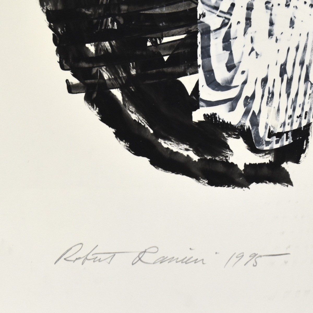 Robert Ranieri, American (Born 1930) Oil on Paper "Black and White Abstract Composition" Signed and Dated 1995 Lower Left. Unframed. Measures 23-7/8" x 35-3/4". Please note, this lot will be rolled in a shipping tube. Condition: Minor creases otherwise good condition. Estimate: $50.00 - $150.00 Domestic Shipping: $45.00
