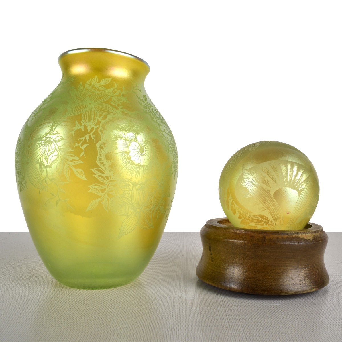 Two Orient & Flume Irridescent chartreuse Art Glass. Paperweight with Dragonfly's, signed to bottom and numbered 42/50 D1980E.Measures 2-1/2" x 3". Dan Shura Vase with a summer garden marked Shura to side and signed approperately to bottom 1982 2165 EVS. Measures 6-3/4" H x 4-1/2" W. accompanied by a wooden light base. Condition: Good condition, possible scratch on vase interior. Estimate: $200.00 - $400.00 Domestic Shipping: $78.00