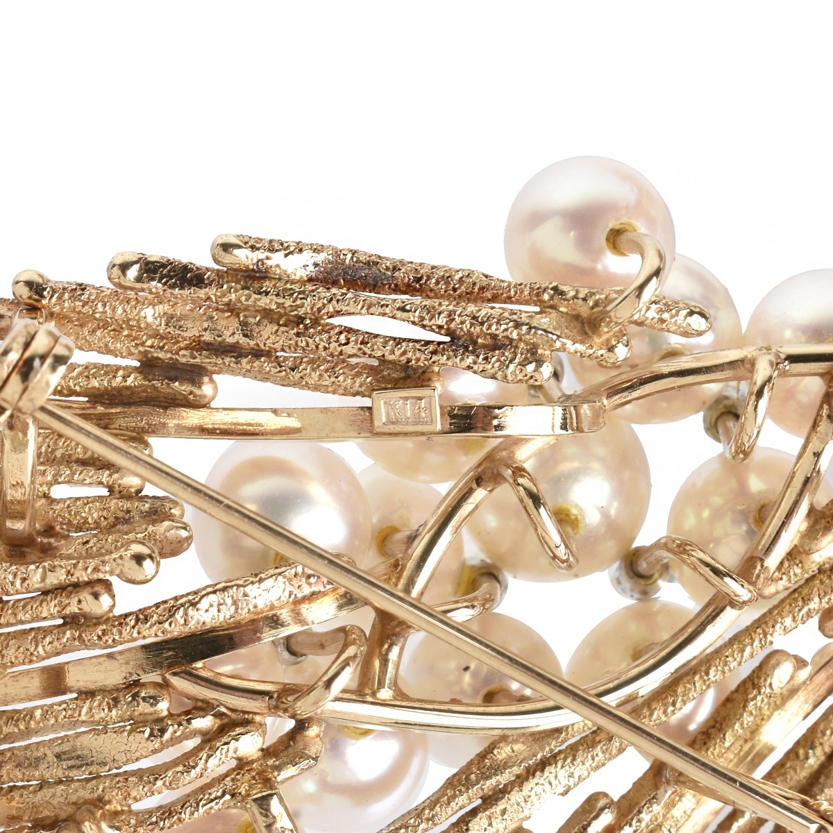 Vintage Pearl, Small Round Brilliant Cut Diamond and 14 Karat Yellow Gold Pendant / Brooch. Pearls with very good luster and polish. Largest pearl measure 7mm. Diamonds F-G color, VS clarity. Stamped 14K. Measures 1-1/2" x 2-7/8". Approx. weight: 22.86 grams. Condition: Very good vintage condition. For additional information and/or WhatsApp video please contact our resident GIA Graduate Gemologist, Russ Kodner at 954.650.5030 Estimate: $500.00 - $700.00 Domestic Shipping: $40.00