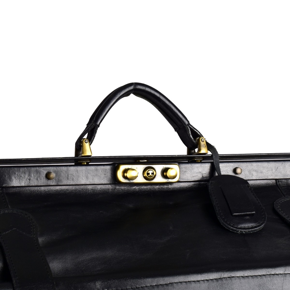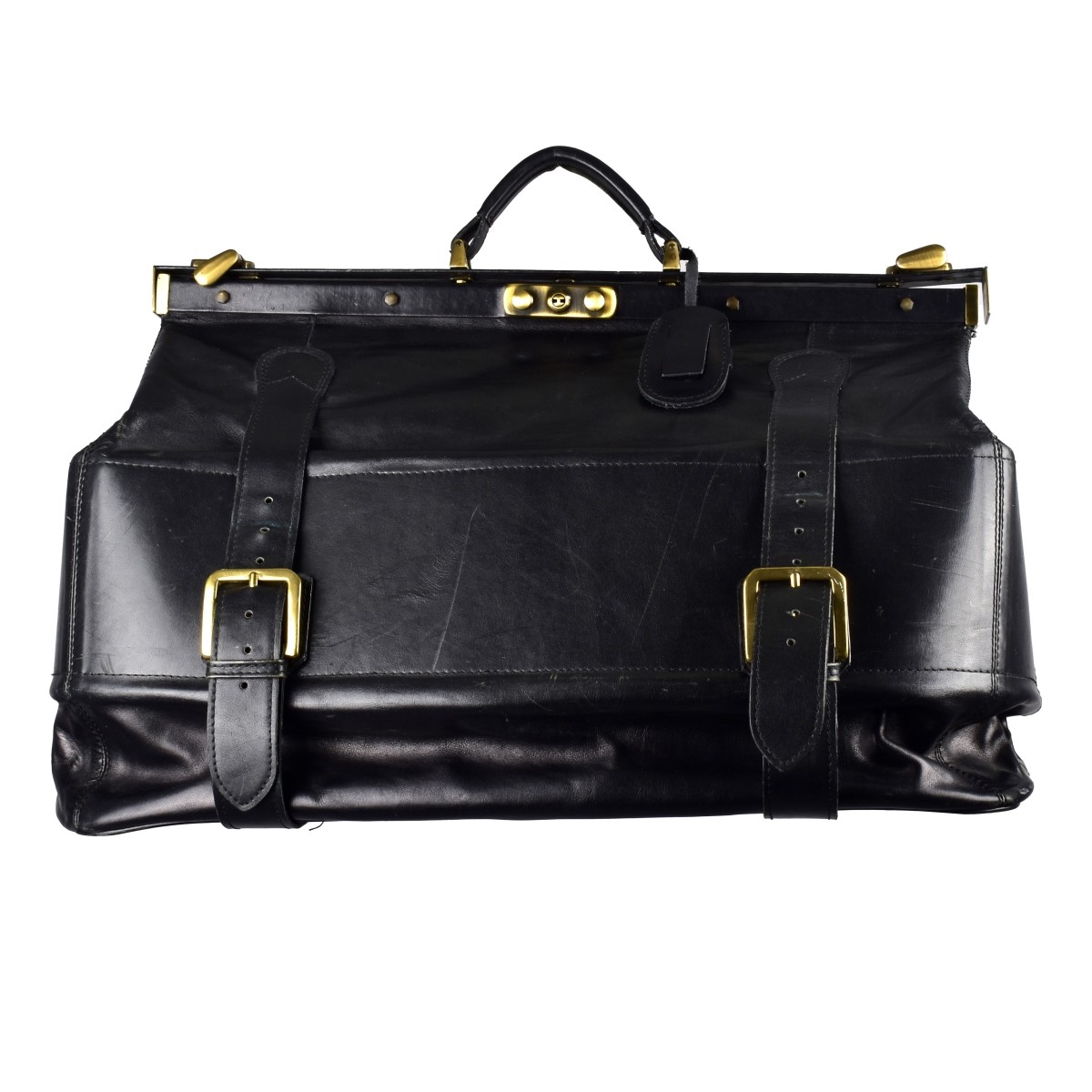 Vintage Lion Line Italian Doctor's Style Leather Bag with Brass Mounts. Labeled on the interior. Measures 11-3/4" x 20-1/2" x 11-1/2". Condition: Scuffs to the surface, spotting on the interior. Estimate: $200.00 - $400.00 Domestic Shipping: $88.00