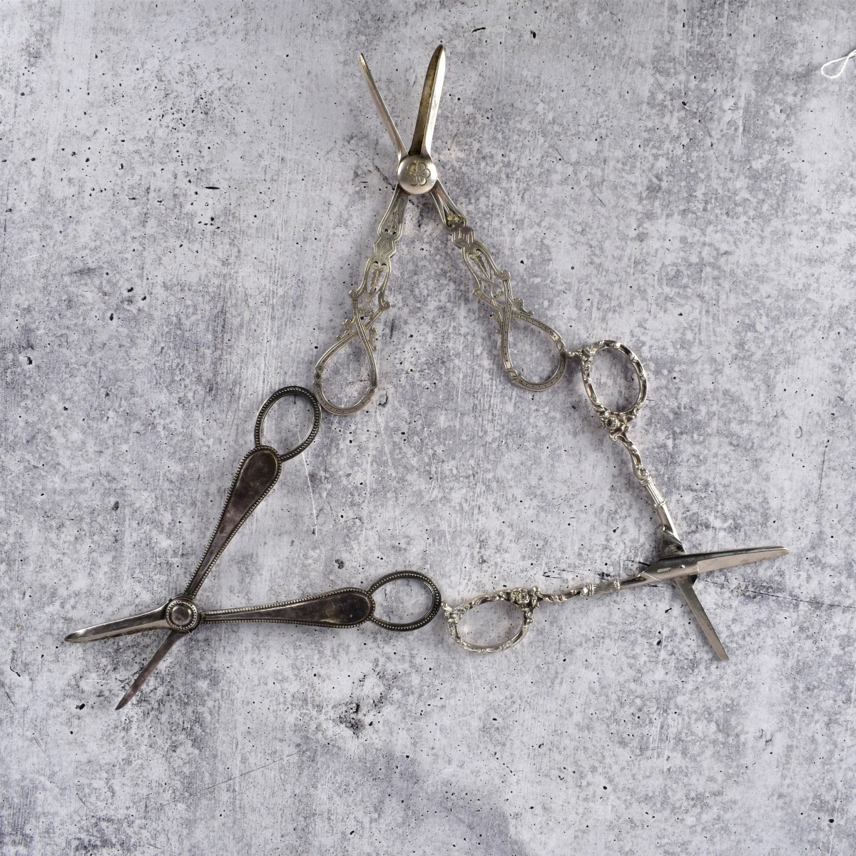 Grouping of Three Vintage English Silver Grape Shears. Each are hallmarked. Longest measures 6-3/4". Total approx. weight: 7.97 troy ounces. Condition: Good condition. Estimate: $50.00 - $150.00 Domestic Shipping: $45.00