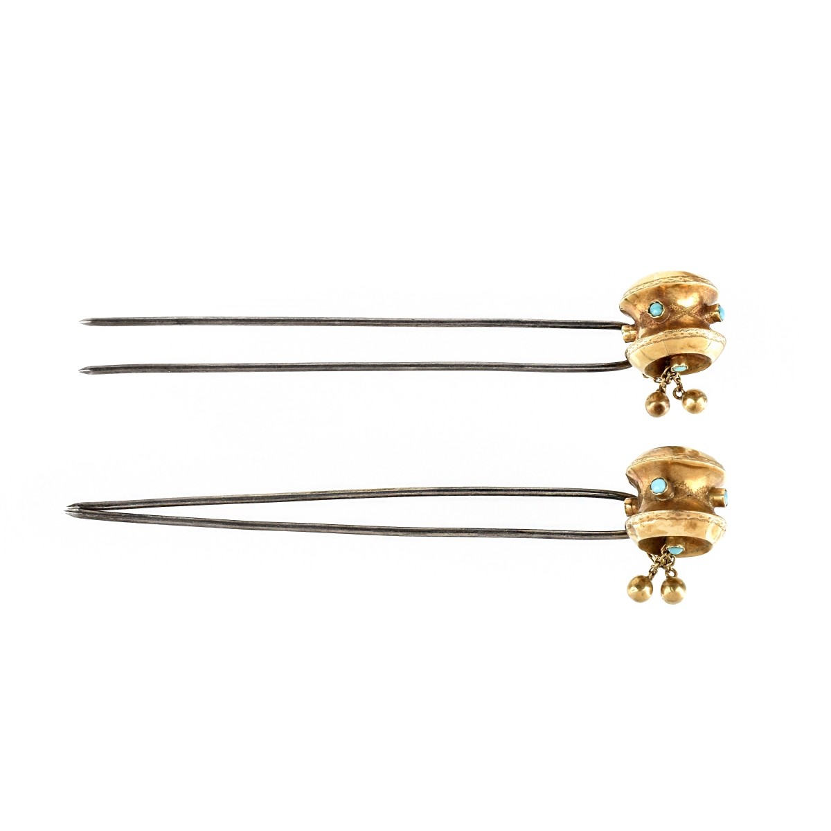 Antique 14 Karat Yellow Gold and Cabochon Turquoise Hat Pins. Metal prongs. Measure 4-5/8" L, 5/8" W. Approx. gross weight: 17.45 grams. Condition: Good antique condition. Estimate: $300.00 - $400.00 Domestic Shipping: $40.00