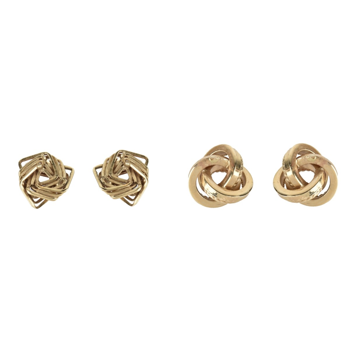 Two Vintage Pair of 14 Karat Yellow Gold Earrings. Larger pair measure 3/4" x 3/4". Approx. total weight: 3.44 grams. Condition: Very good vintage condition. Missing post backs. Need cleaning. Estimate: $300.00 - $400.00 Domestic Shipping: $40.00