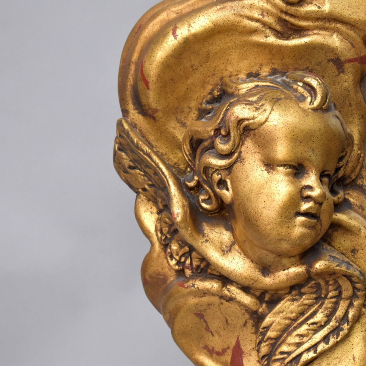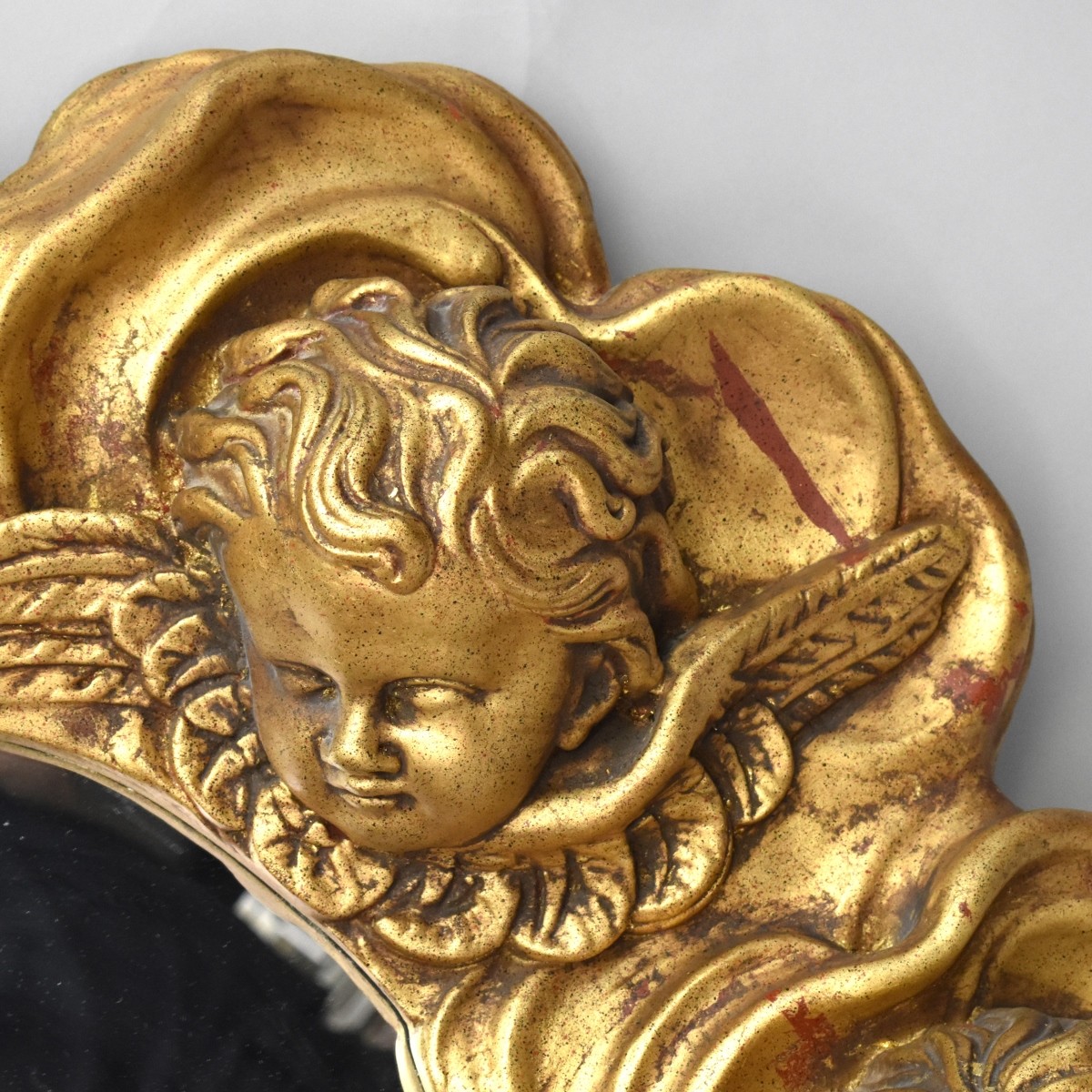 Large Empire Style Gilt Gesso Mirror with Raised Putti Relief. Measures 53" x 38-1/2" x 8". Condition: Rubbing to the surface otherwise good condition. Estimate: $200.00 - $400.00 Domestic Shipping: Third party