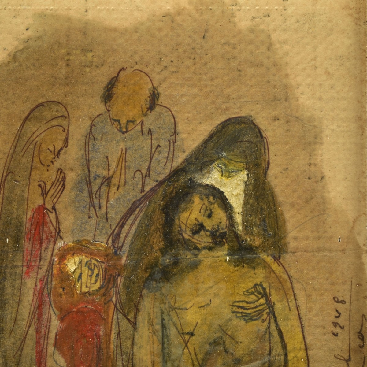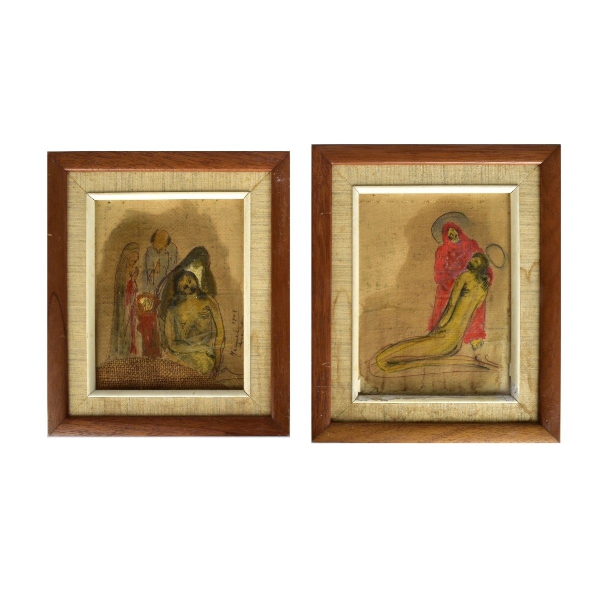 Manuel Bordogna, Venezuelan (20th Century) Grouping of Mixed Media Paintings on Paper Laid on Canvas "Religious Scenes" Both are Signed. Each is marked on the obverse side. Largest frame measures 11-1/2" x 9-5/8". Smaller frame measures 11-1/8" x 9-1/2". Condition: One painting has a partial loss to the paper. Estimate: $50.00 - $150.00 Domestic Shipping: $75.00