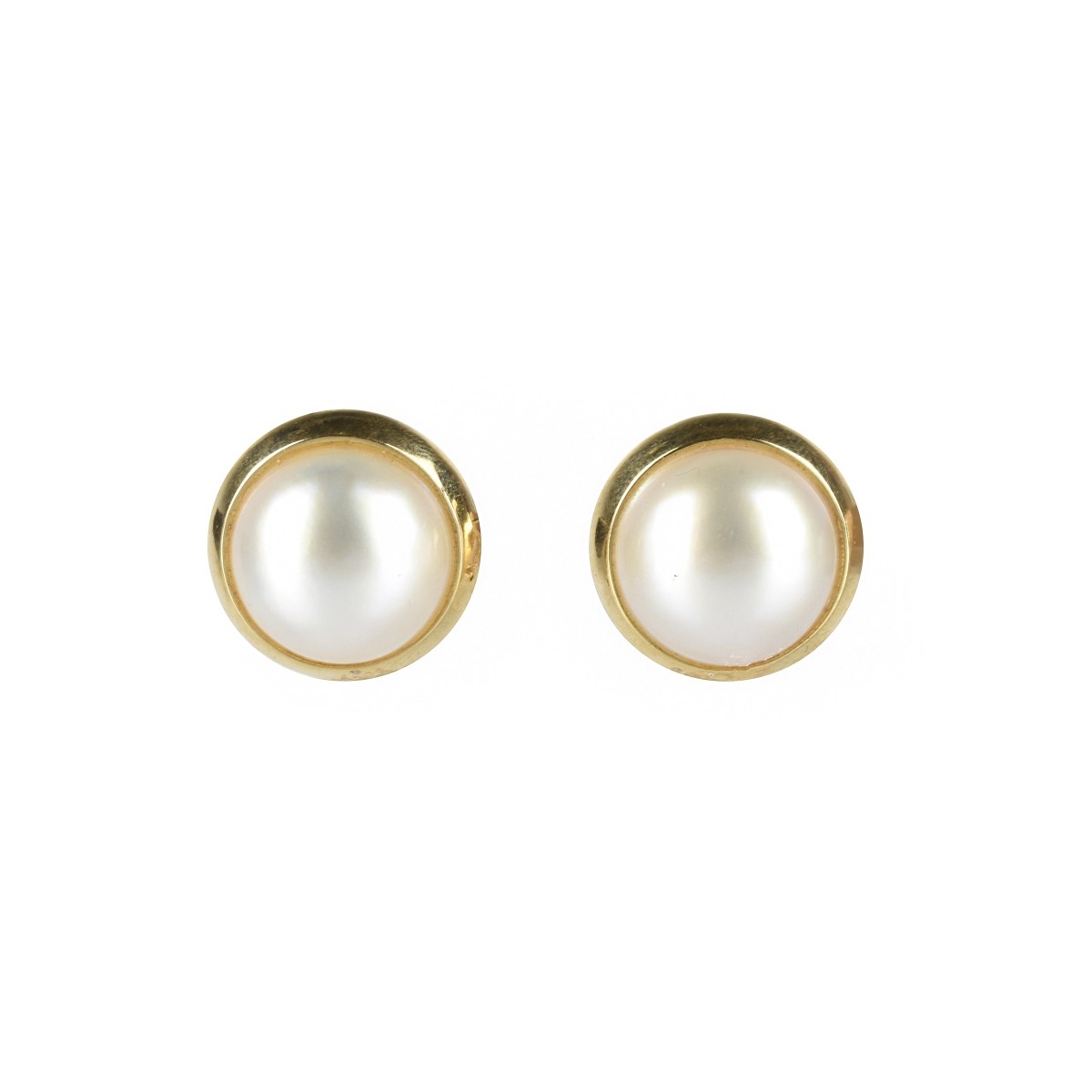 Vintage 15.0mm Mabe Pearl and 14 Karat Yellow Gold Earrings. Pearls with good luster and polish. Stamped 585. Measure 3/4" diam. Approx. total weight: 9.73 grams. Condition: Good vintage condition. Need cleaning. Estimate: $150.00 - $250.00 Domestic Shipping: $40.00