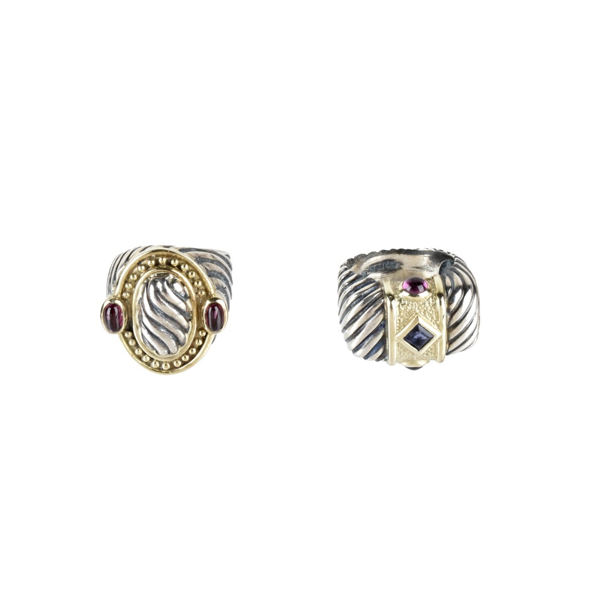 Two Gemstone, 14 Karat Yellow Gold and Sterling Silver Rings. Stamped 14K SS. Ring sizes 6. Approx. total weight: 25.72 grams. Condition: Very good condition. Need cleaning. Estimate: $300.00 - $400.00 Domestic Shipping: $40.00