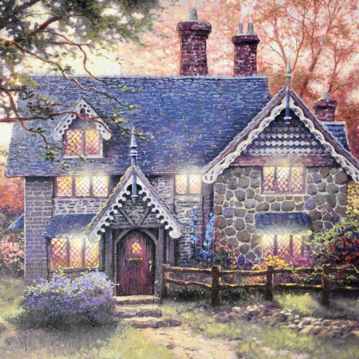 Thomas Kinkade, American (1958 - 2012) Hand Embellished Giclee on Canvas "Gingerbread Cottage" Signed Lower Right, Numbered 132/250 E/P. Tag affixed to the frame. COA to accompany the lot. Thomas Kinkade label attached en verso. Measures 18" x 24". Frame measures 26-1/4" x 32-1/4". Condition: Good condition. Estimate: $200.00 - $600.00 Domestic Shipping: $165.00