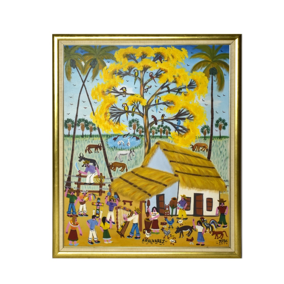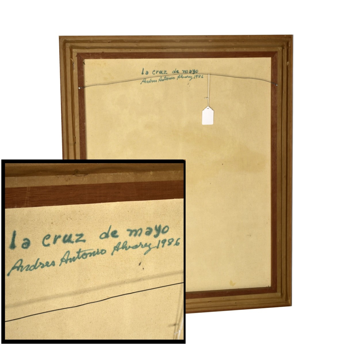 Andres Antonio Alvarez, Venezuelan (20th Century) Oil on Canvas "La Cruz De Mayo, 1986" Signed Lower Center. Inscribed en verso. Measures 39-1/2" x 31-1/2". Frame measures 43-1/2" x 35-1/2". Condition: Good condition. Estimate: $50.00 - $150.00 Domestic Shipping: Third party