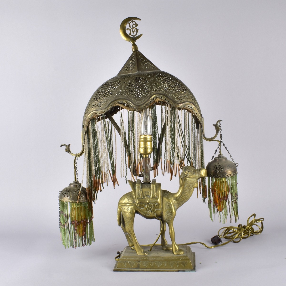 Vintage Middle Eastern Brass Camel Table Lamp with Hanging Beads and Pierced Shade. Overall measures 24-1/2" x 18" x 7". Condition: Shade is slightly leaning forward. One support for the shade needs to be reset. Missing beads. Oxidation to the surface. Estimate: $100.00 - $300.00 Domestic Shipping: Third party