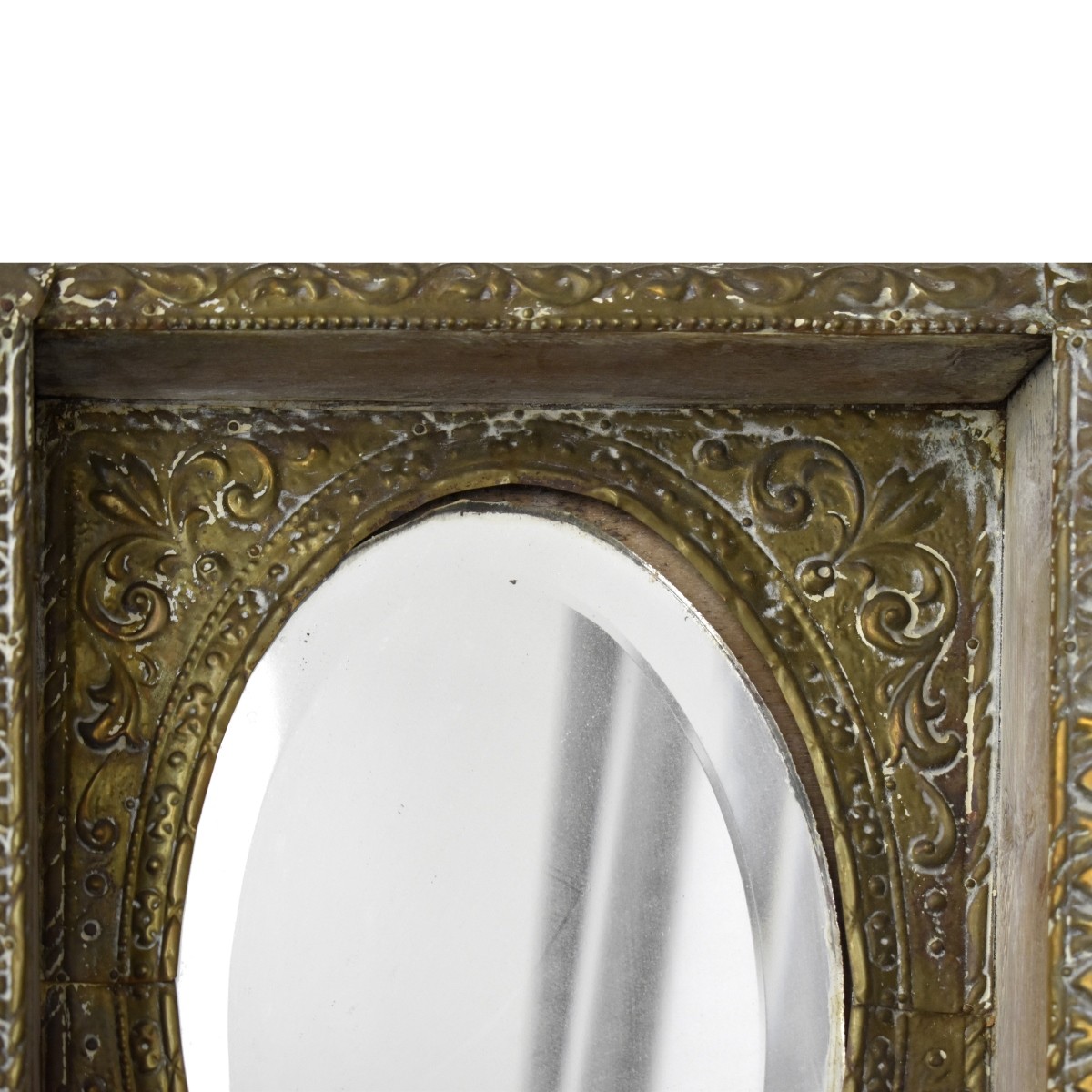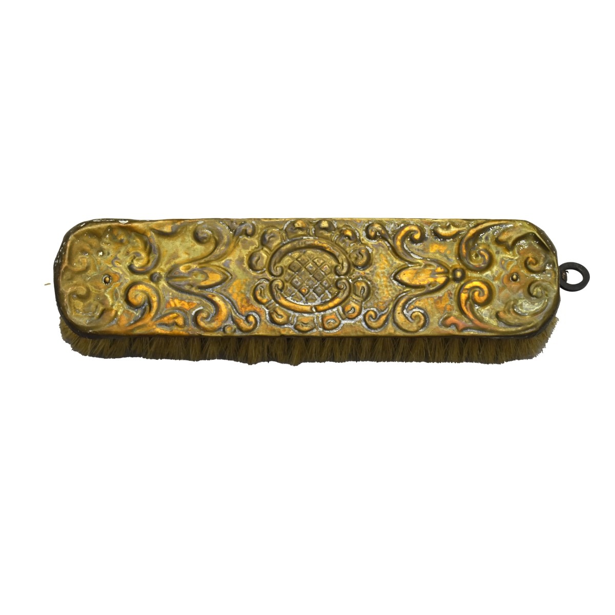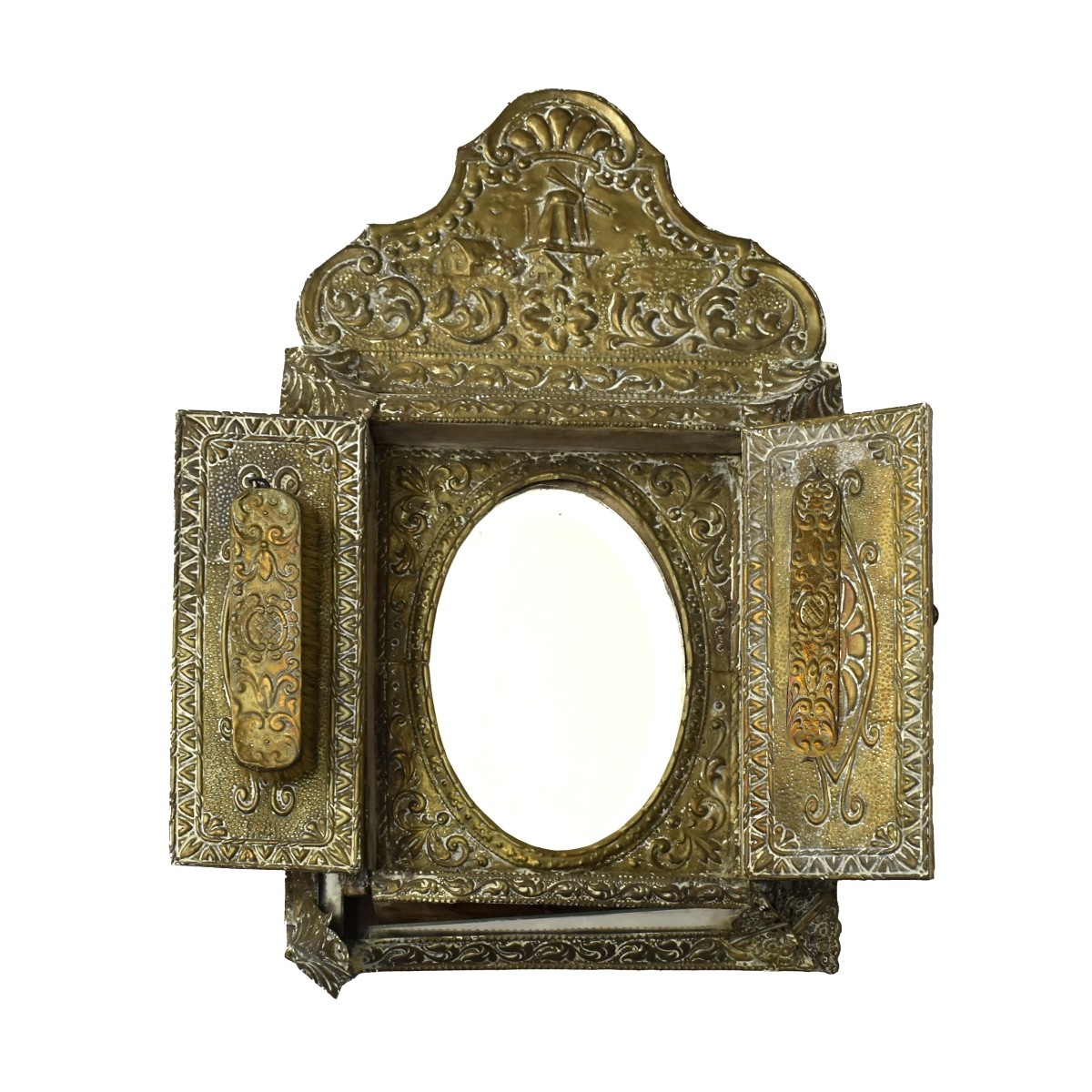 Antique French Repousse Brass Wall Hanging Cushion Mirror Cabinet. Two brushes to accompany the lot. Measures 25-1/2" x 15". Condition: White spotting. Rubbing. Estimate: $100.00 - $300.00 Domestic Shipping: Third party