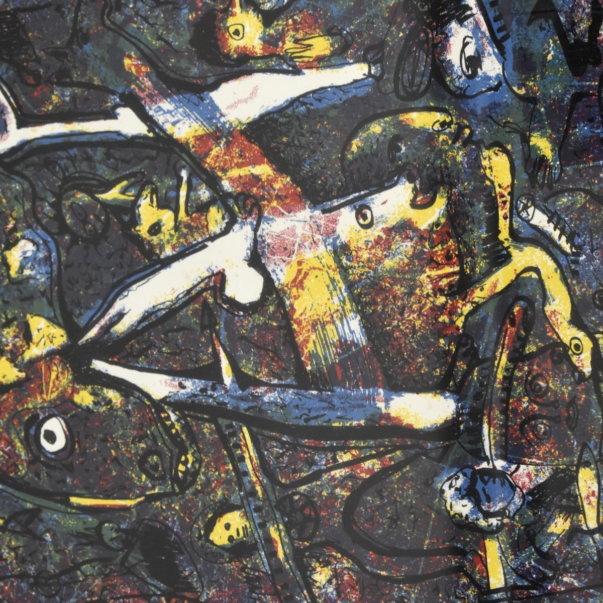 Andres Puig, Cuban (B. 1948) Lithograph in Color on Paper "Splash" Signed and Numbered 157/200. Watermark lower left. Sight measures 18" x 15-1/4". Frame measures 28-1/2" x 25-1/2". Condition: Foxing to the paper otherwise good condition. Estimate: $100.00 - $300.00 Domestic Shipping: $145.00