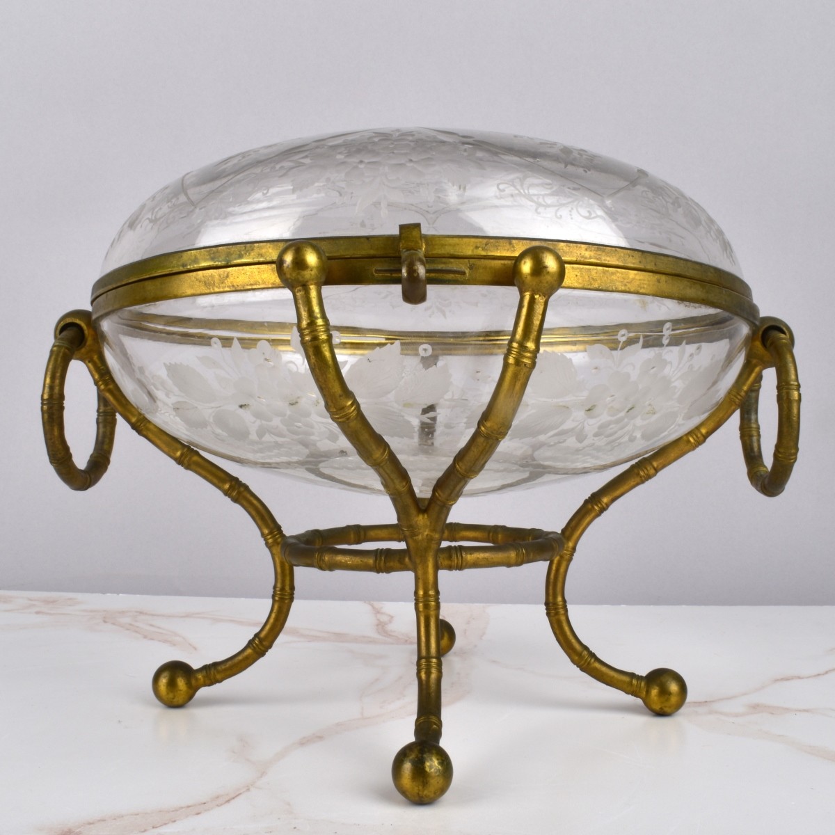 Antique French Etched Crystal and Bronze Round Box. Measures 7-3/4" x 11". Condition: Good condition. Estimate: $200.00 - $400.00 Domestic Shipping: $115.00