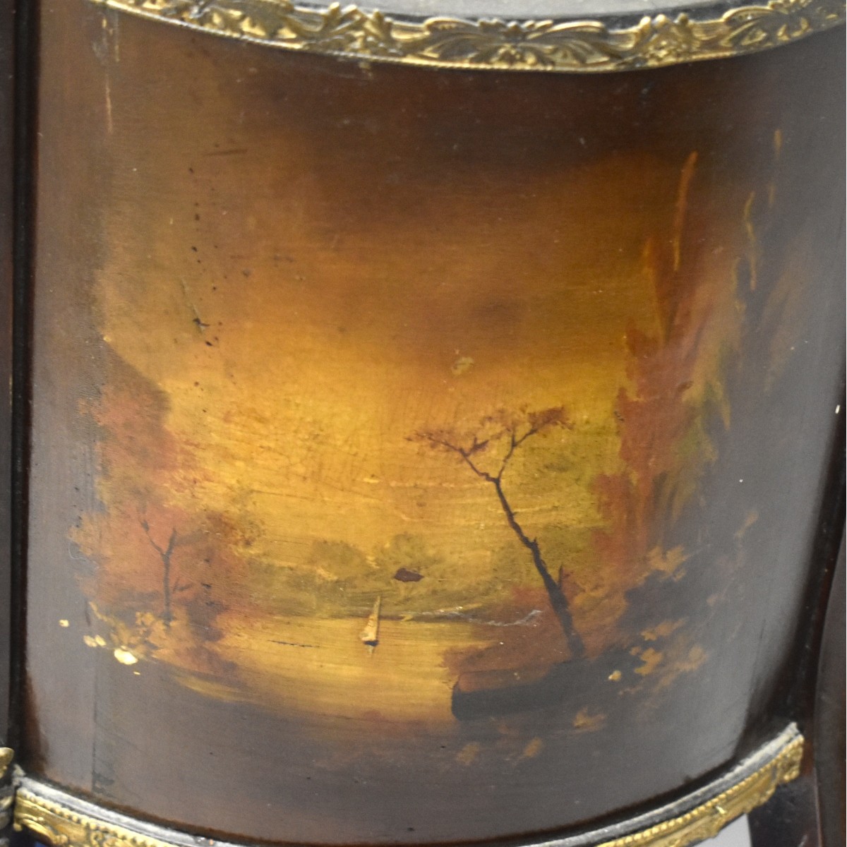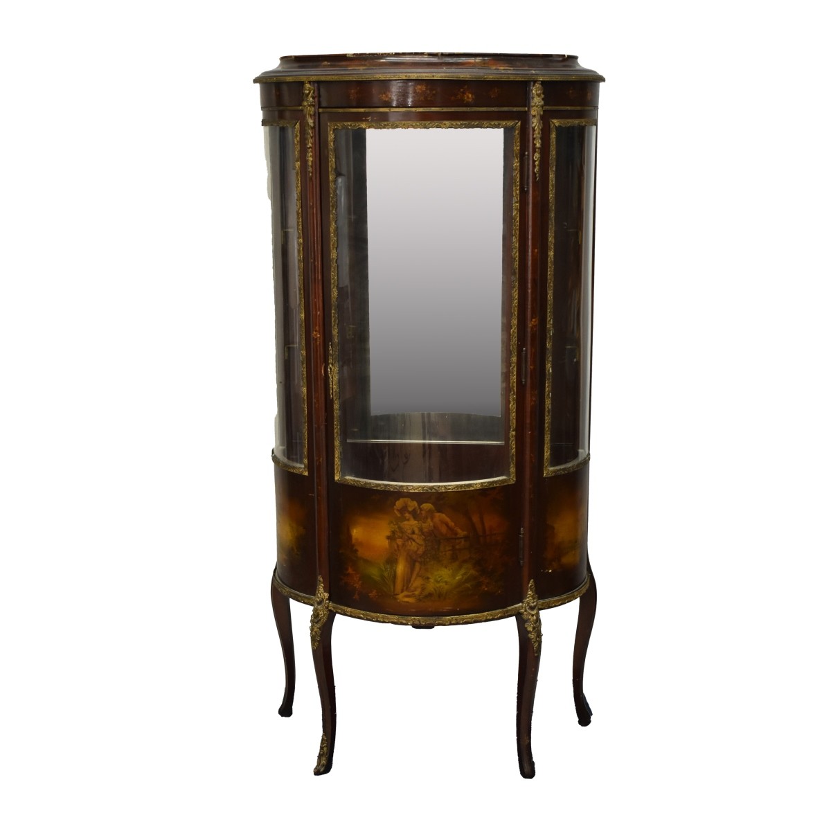Mid Century Vernis Martin Style Hand Painted Wood and Glass Vitrine. Measures 55-1/2" x 26-1/4" x 13-1/2". Condition: No glass shelves, wear to the veneered top. Losses to the top trim. Scuff to the surface. Estimate: $200.00 - $400.00 Domestic Shipping: Third party