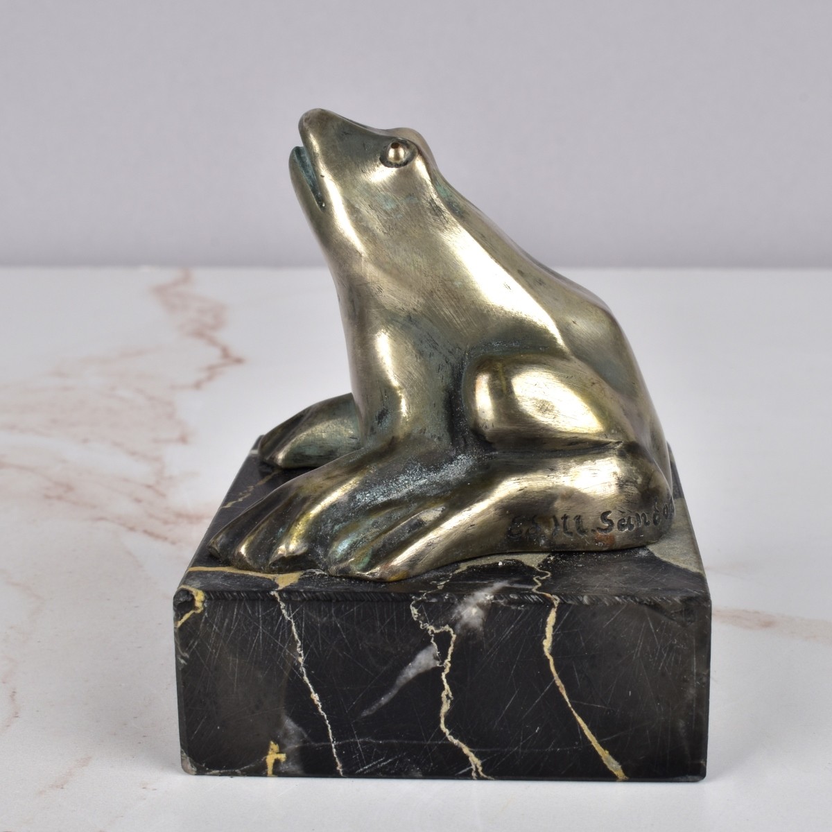 Edouard-Marcel Sandoz, Swiss (1881 - 1971) Bronze Sculpture Presented on a Marble Base "Frog" Signed on Reverse. Measures 2-7/8" x 2-3/4". Condition: Good condition. Estimate: $600.00 - $800.00 Domestic Shipping: $52.00