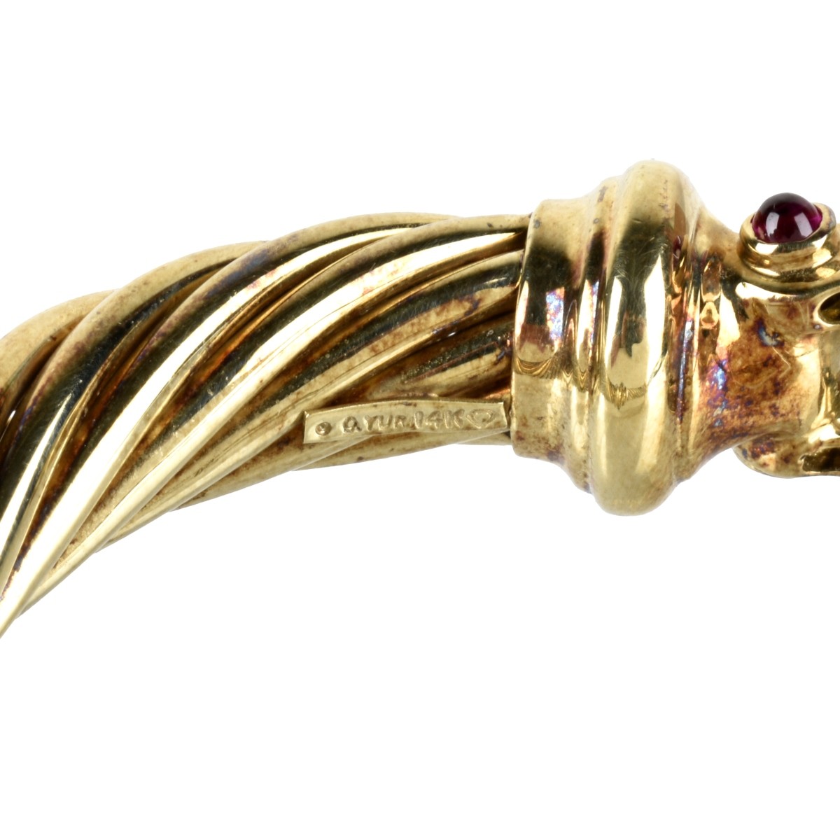 David Yurman 14 Karat Yellow Gold Hinged Bangle Bracelet. Set with round brilliant cut diamonds, E-F color, VS1-VS2 clarity and accented with cabochon color gemstones. Signed, stamped 14K. Measures 6-1/2" interior circumference. Approx. weight: 48.10 grams. Condition: Very good condition. For additional information and/or WhatsApp video please contact our resident GIA Graduate Gemologist, Russ Kodner at 954.650.5030 Estimate: $3000.00 - $4000.00 Domestic Shipping: $40.00