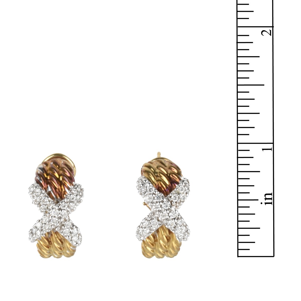 Vintage David Yurman Pave Set Round Brilliant Cut Diamond and 18 Karat Yellow and White Gold Earrings. Diamonds F-G color, VS1-VS2 clarity. Signed, stamped 18K. Measure 7/8" H, 5/8" W. Approx. weight: 17.01 grams Condition: Very good vintage condition. Need cleaning. For additional information and/or WhatsApp video please contact our resident GIA Graduate Gemologist, Russ Kodner at 954.650.5030 Estimate: $1000.00 - $1500.00 Domestic Shipping: $40.00