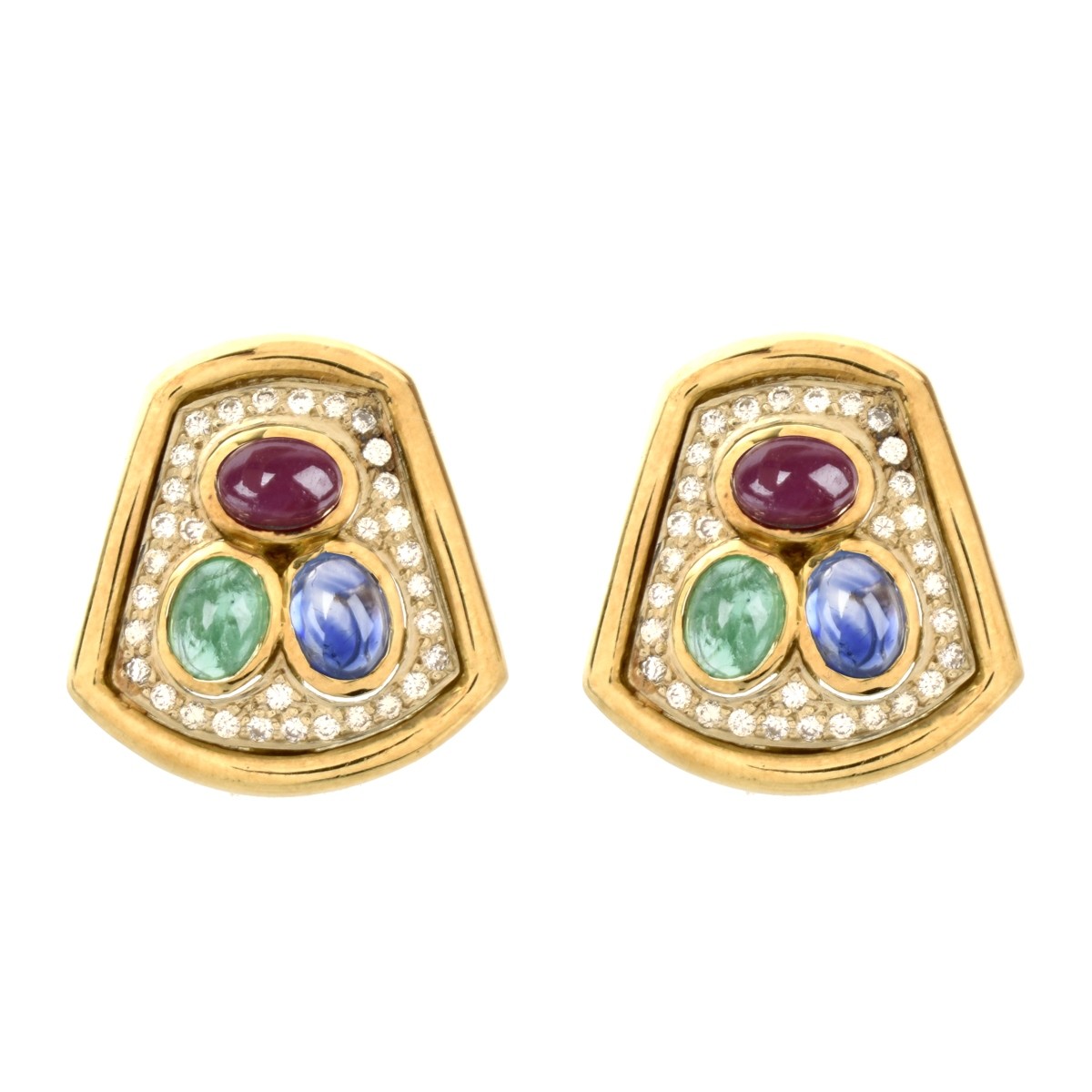 Vintage Approx. 2.50 Carat TW Pave Set Round Brilliant Cut Diamond, 1.20 Carat Oval Cabochon Ruby, 1.20 Carat Oval Cabochon Emerald, 1.20 Carat Oval Cabochon Sapphire and 18 Karat Yellow Gold Ear Clips. Diamonds E Color, VS1 clarity. Measure 1" x 7/8". Approx. total weight: 27.88 grams. Condition: Very good vintage condition. For additional information and/or WhatsApp video please contact our resident GIA Graduate Gemologist, Russ Kodner at 954.650.5030 Estimate: $1500.00 - $2500.00 Domestic Shipping: $40.00