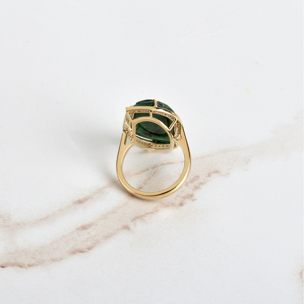 Approx. 12.06 Carat Mughal style Carved Leaf Form Natural No Treatment Emerald, .30 Carat TW Small Round Cut Diamond and 14 Karat Yellow Gold Ring. Emerald with good color. Diamonds G-H color. VS-SI clarity. Ring size 6-3/4. Approx. weight: 7.53 grams. Condition: Very good condition. For additional information and/or WhatsApp video please contact our resident GIA Graduate Gemologist, Russ Kodner at 954.650.5030 Estimate: $1300.00 - $1600.00 Domestic Shipping: $40.00