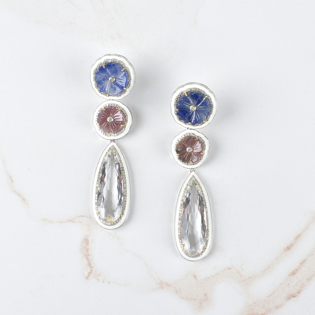 Approx. 18.75 Carat TW Carved Blue and Pink Sapphire, Rock Crystal and Silver Chandelier Earrings accented with White Enamel, Approx. 1.25 Carat TW Small Round Cut Diamonds and with 14 Karat Yellow Gold Posts and Post Backs. Diamonds G-H color, SI clarity. Measure 2-7/8" L, 5/8" W. Approx. total weight: 23.66 grams. Condition: Very good condition. For additional information and/or WhatsApp video please contact our resident GIA Graduate Gemologist, Russ Kodner at 954.650.5030 Estimate: $600.00 - $900.00 Domestic Shipping: $40.00